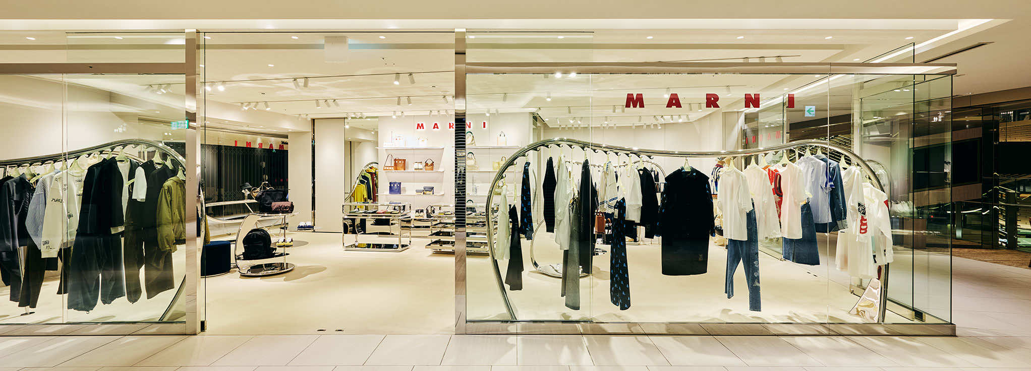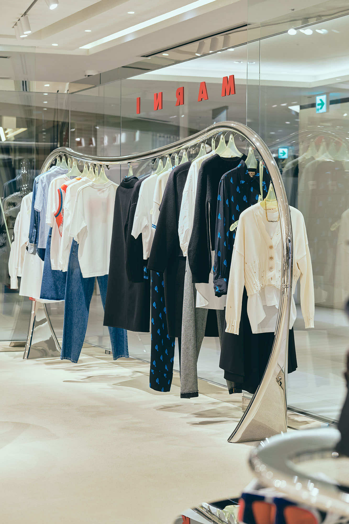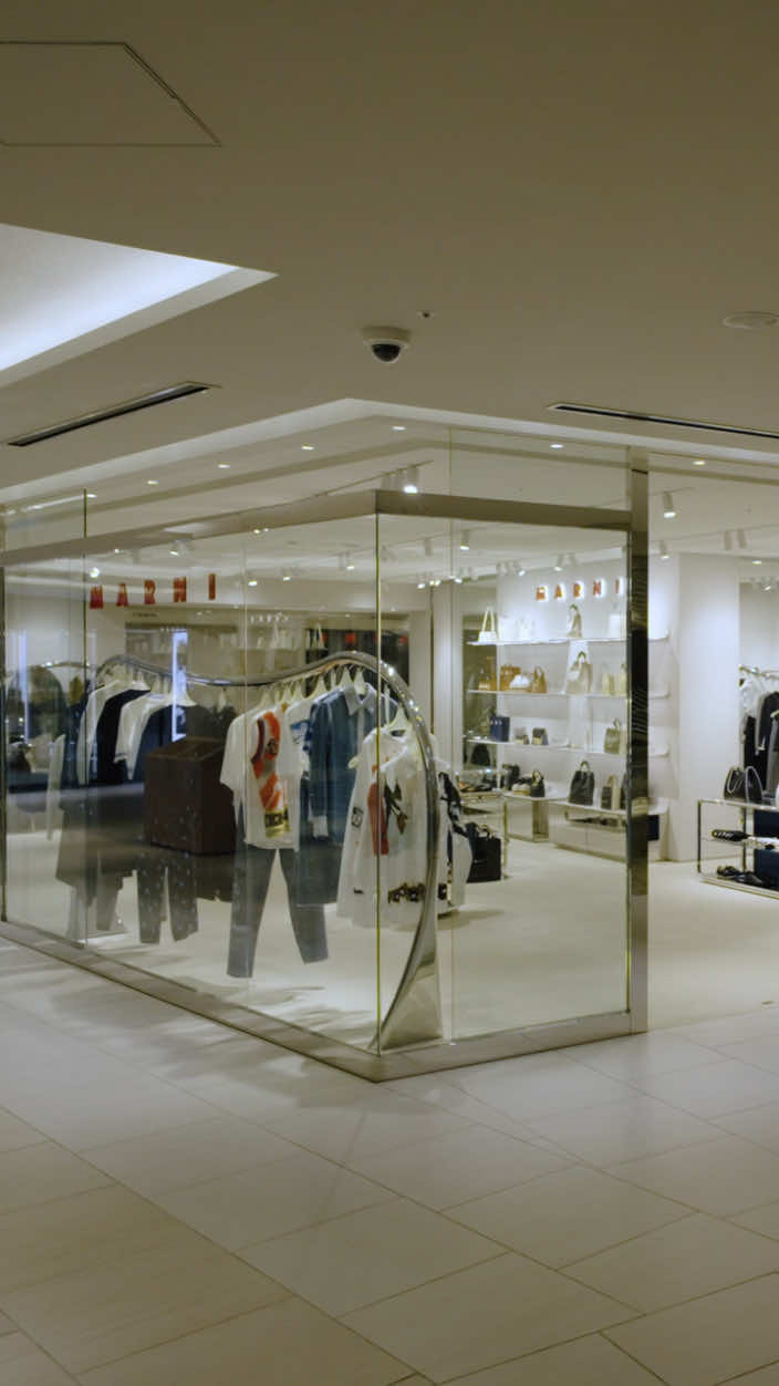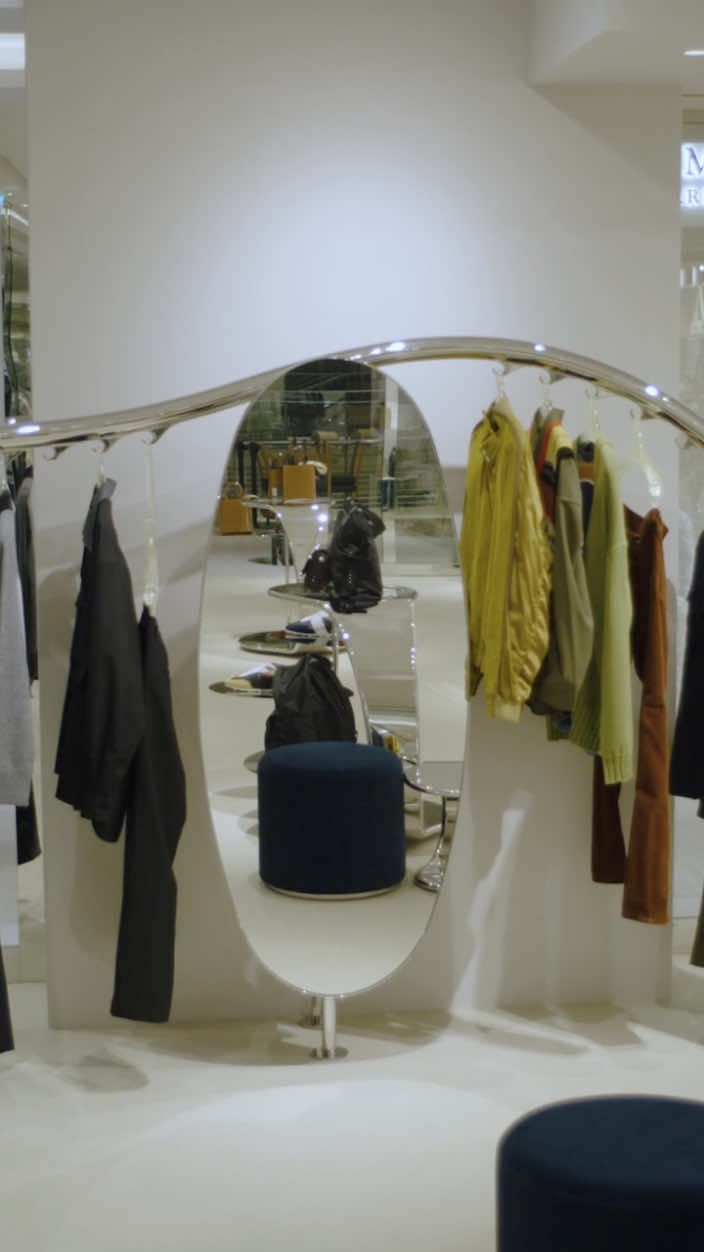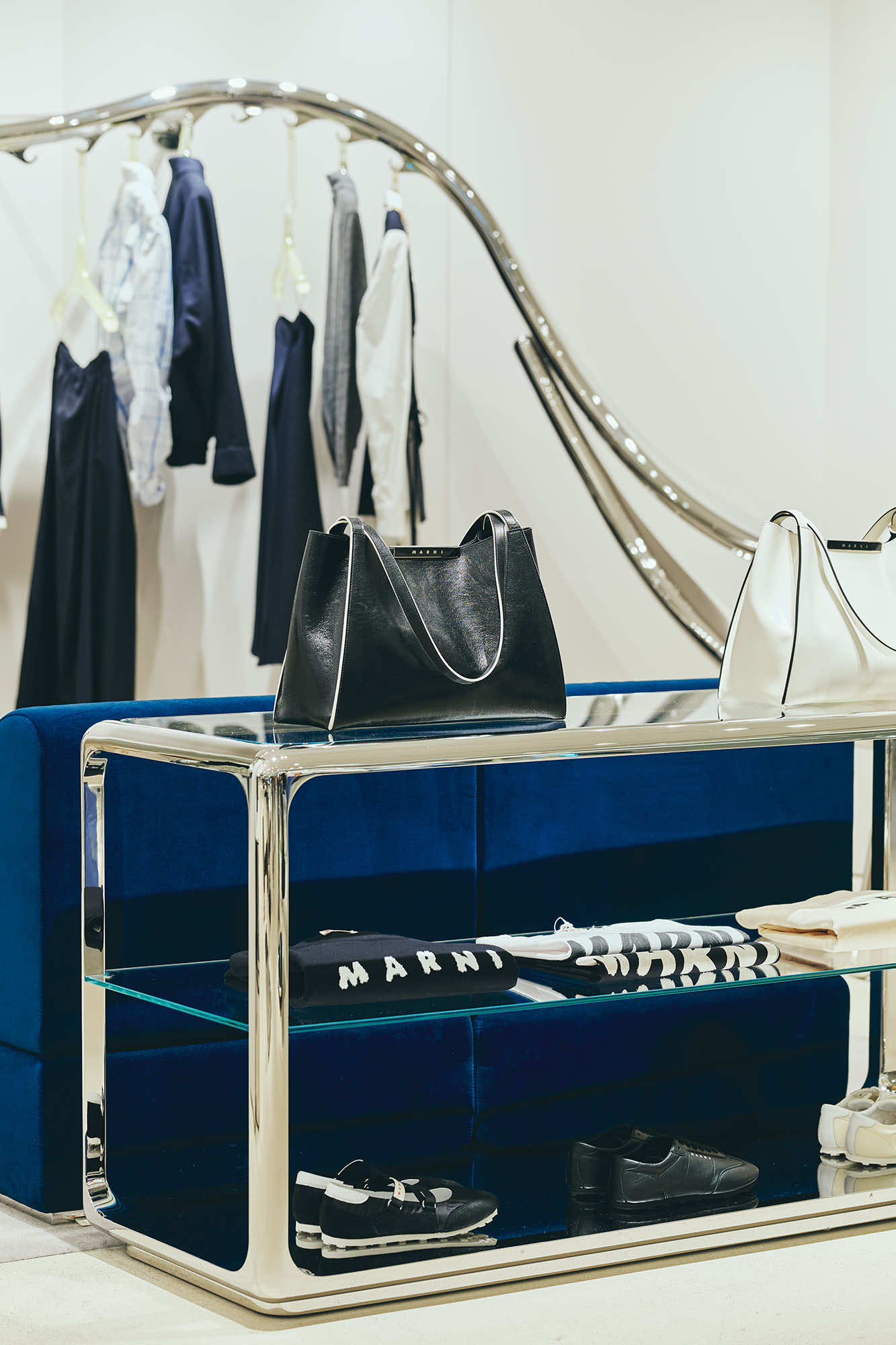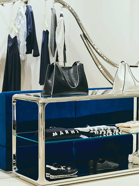 マルニ カフェのオープンに先立ち、6月にリニューアルしたマルニ GINZA SIX。ガラス張りのファサード、柔らかなグレーを基調にした店内には、マルニ ブティックに共通するシンボルともいえる、彫刻的な波状のステンレススチールレールのラックを軸に、メタリックな輝きがアクセントとなった什器や、曲線的なメタルフレームのショーケースなど、1960年代風のデザイン美学を再解釈した有機的かつフューチャリスティックなディテールが散りばめられています。そこに、プルシアンブルーのベルベットソファがアクセントを添えます。シンプルながら、しっかり主張するマルニらしいシルエットと色彩、質感の対比が、エレガントで現代的なムードを演出するインテリアです。
