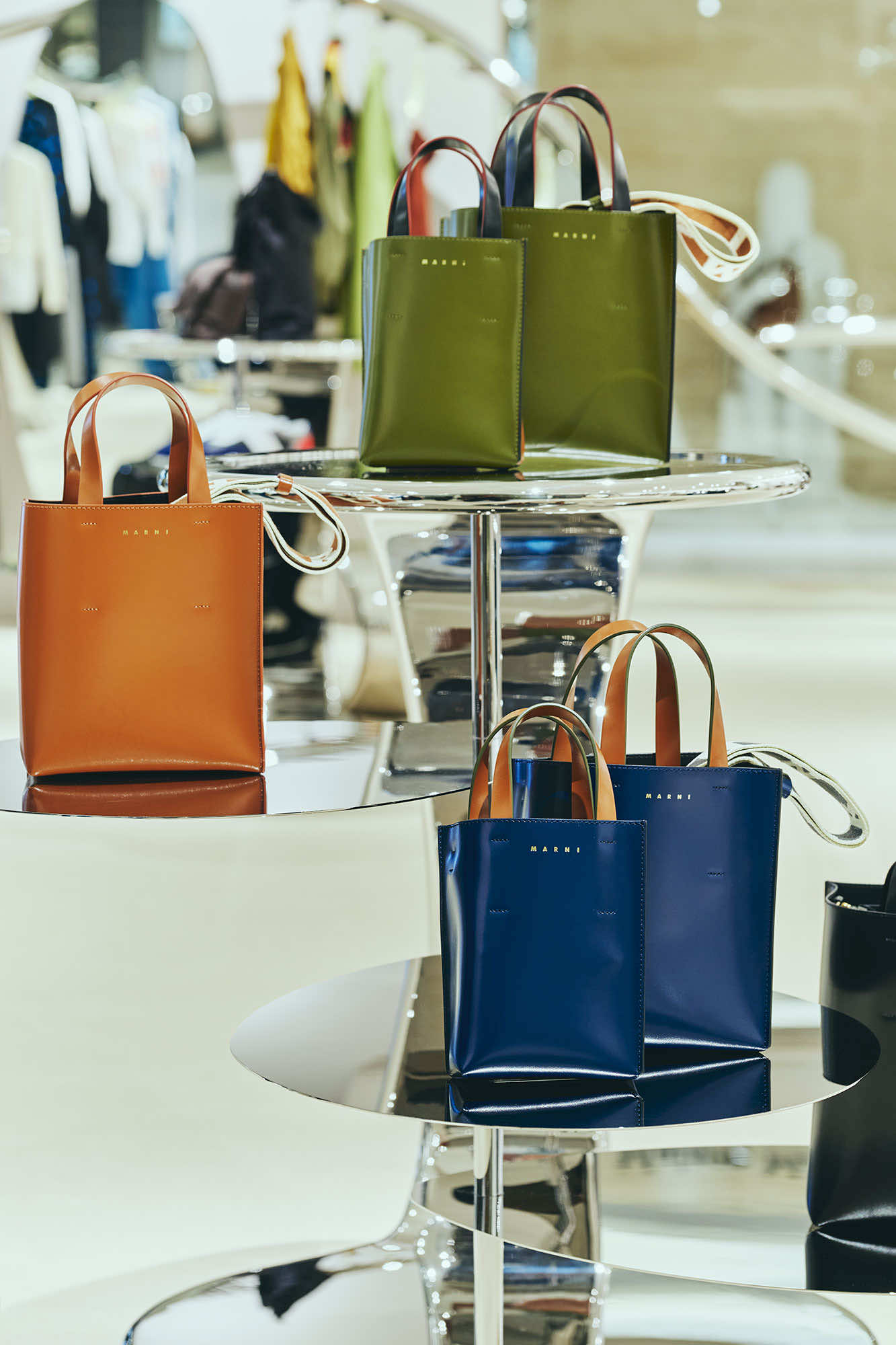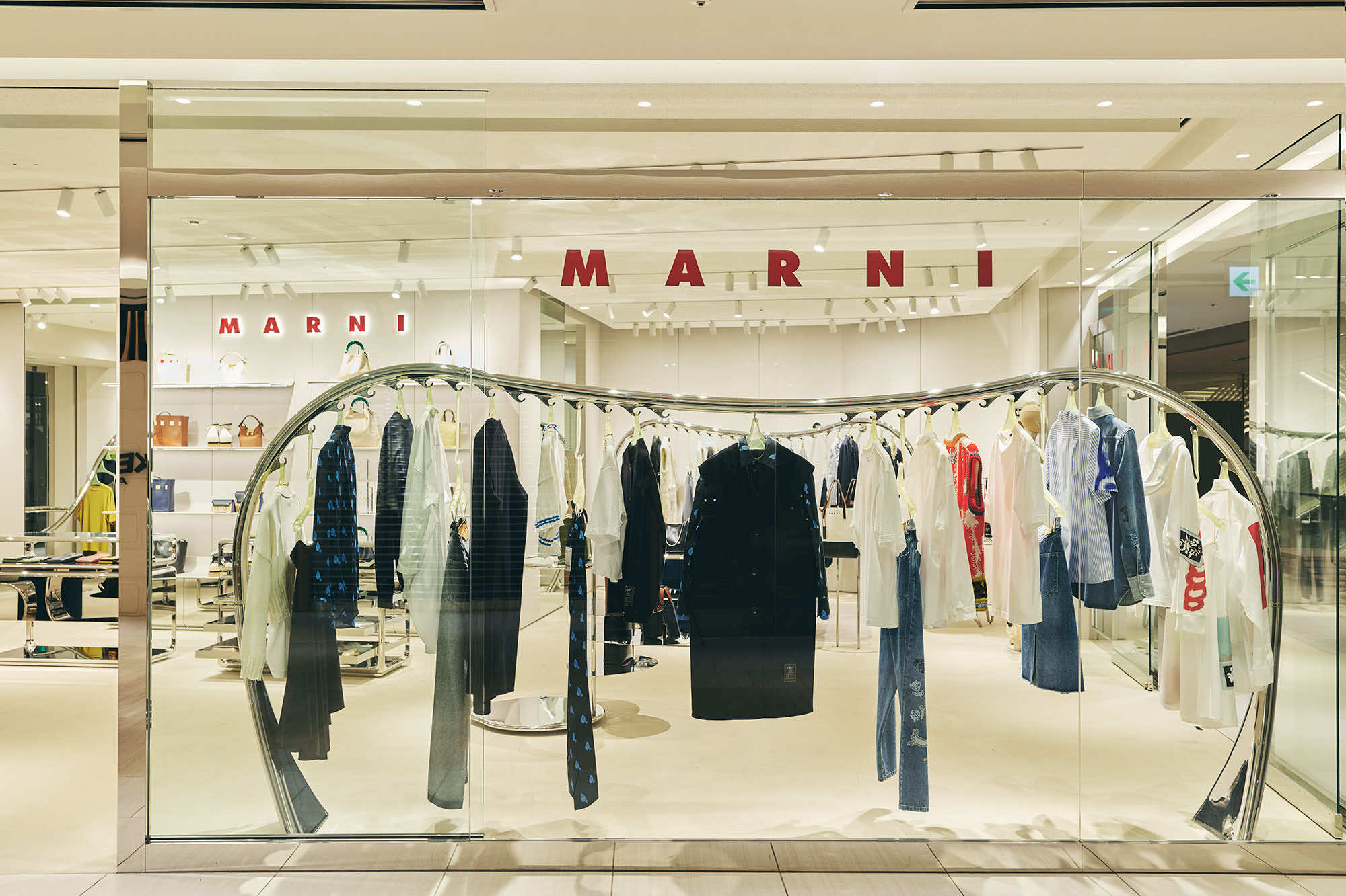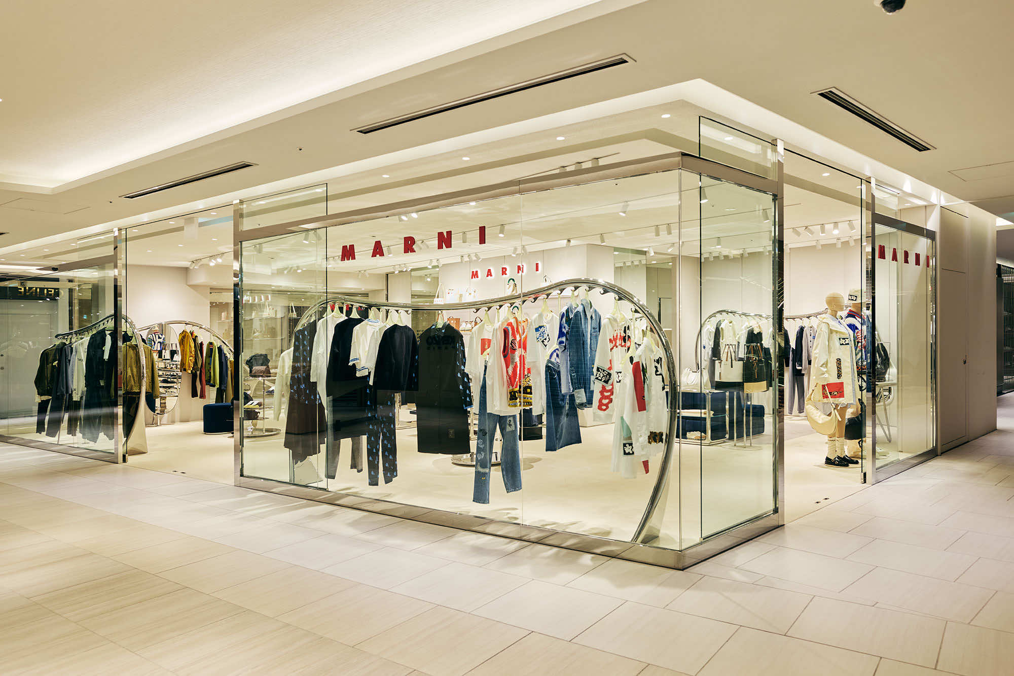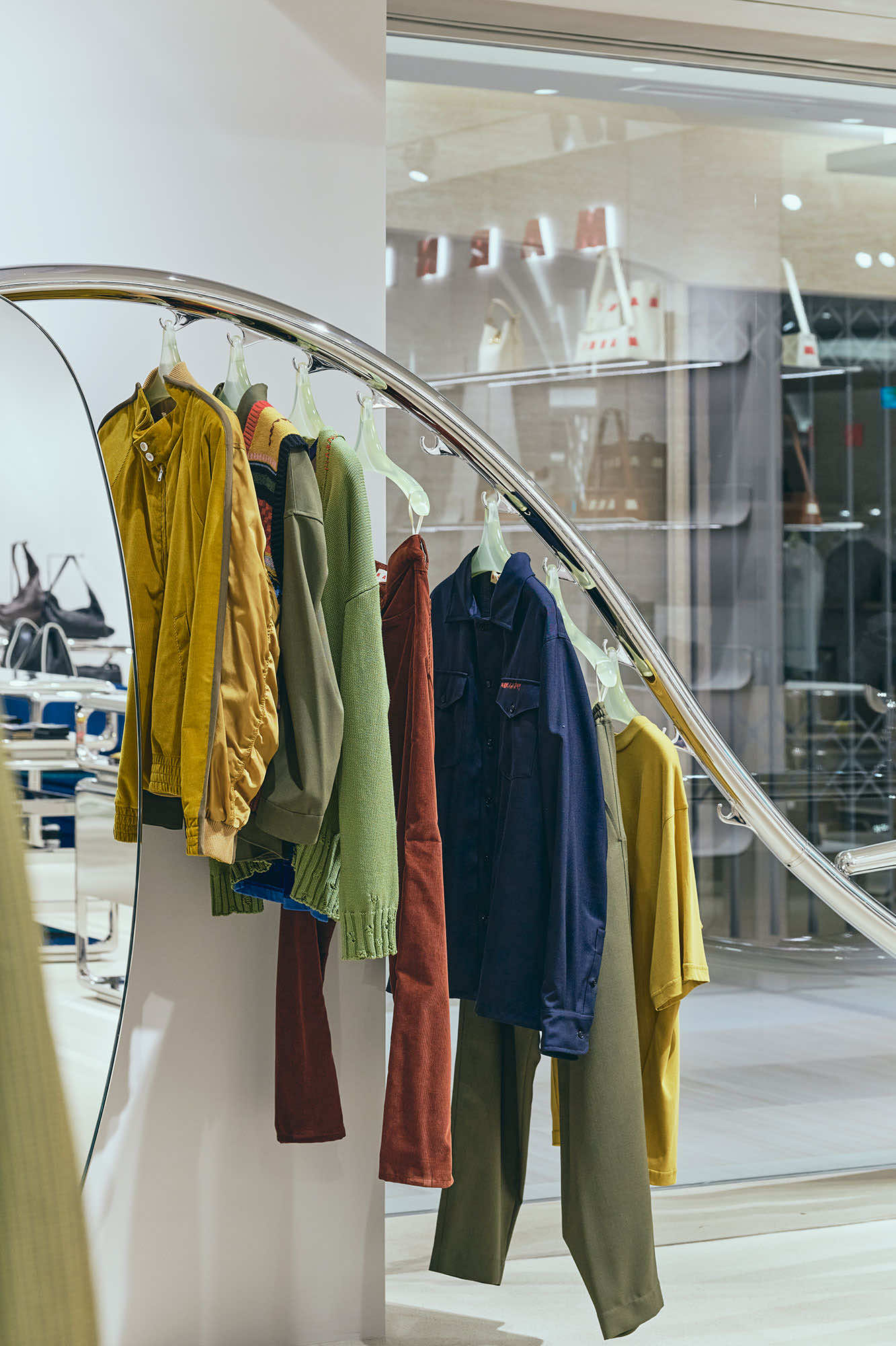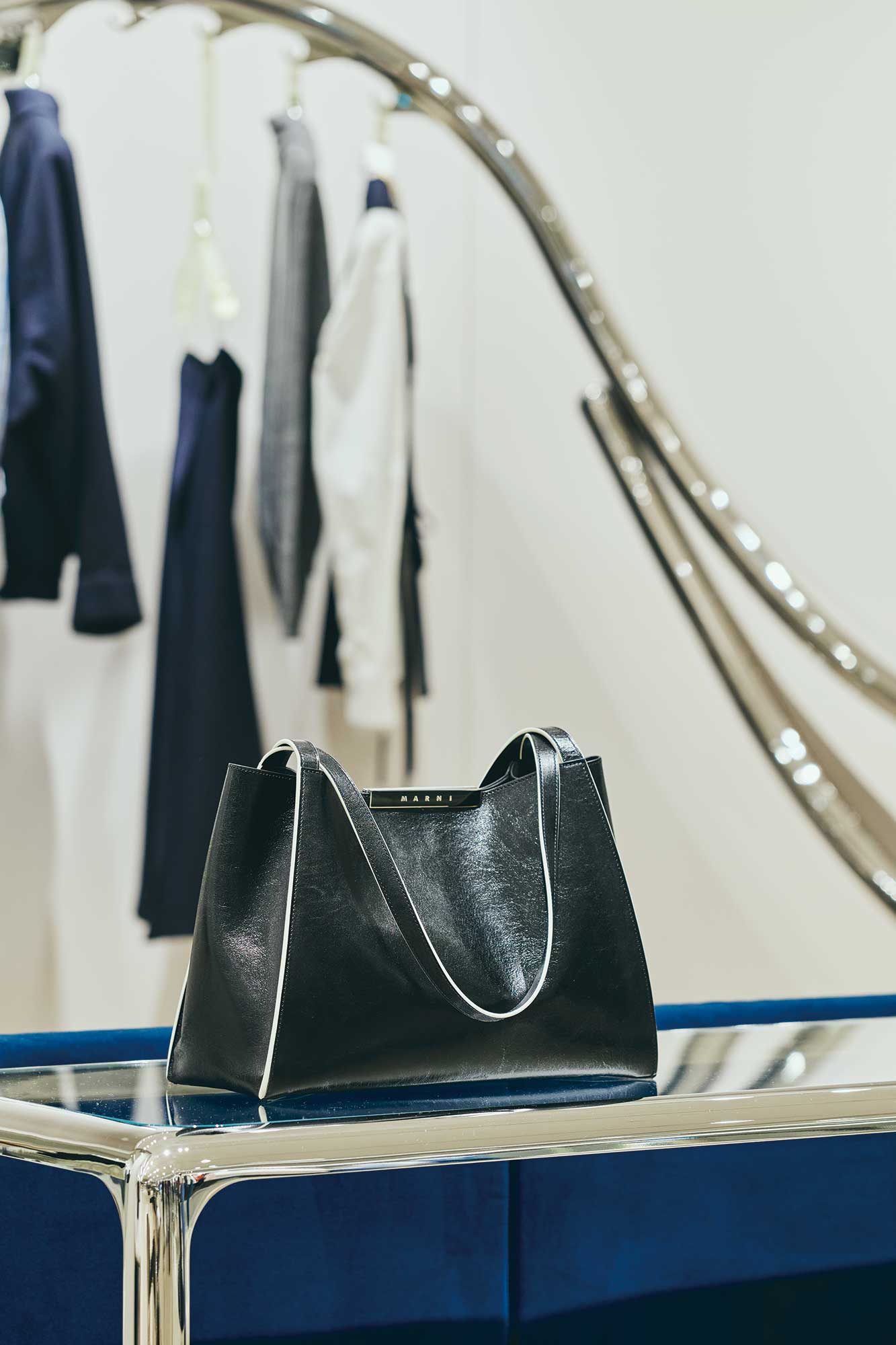 マルニ カフェのオープンに先立ち、6月にリニューアルしたマルニ GINZA SIX。ガラス張りのファサード、柔らかなグレーを基調にした店内には、マルニ ブティックに共通するシンボルともいえる、彫刻的な波状のステンレススチールレールのラックを軸に、メタリックな輝きがアクセントとなった什器や、曲線的なメタルフレームのショーケースなど、1960年代風のデザイン美学を再解釈した有機的かつフューチャリスティックなディテールが散りばめられています。そこに、プルシアンブルーのベルベットソファがアクセントを添えます。シンプルながら、しっかり主張するマルニらしいシルエットと色彩、質感の対比が、エレガントで現代的なムードを演出するインテリアです。