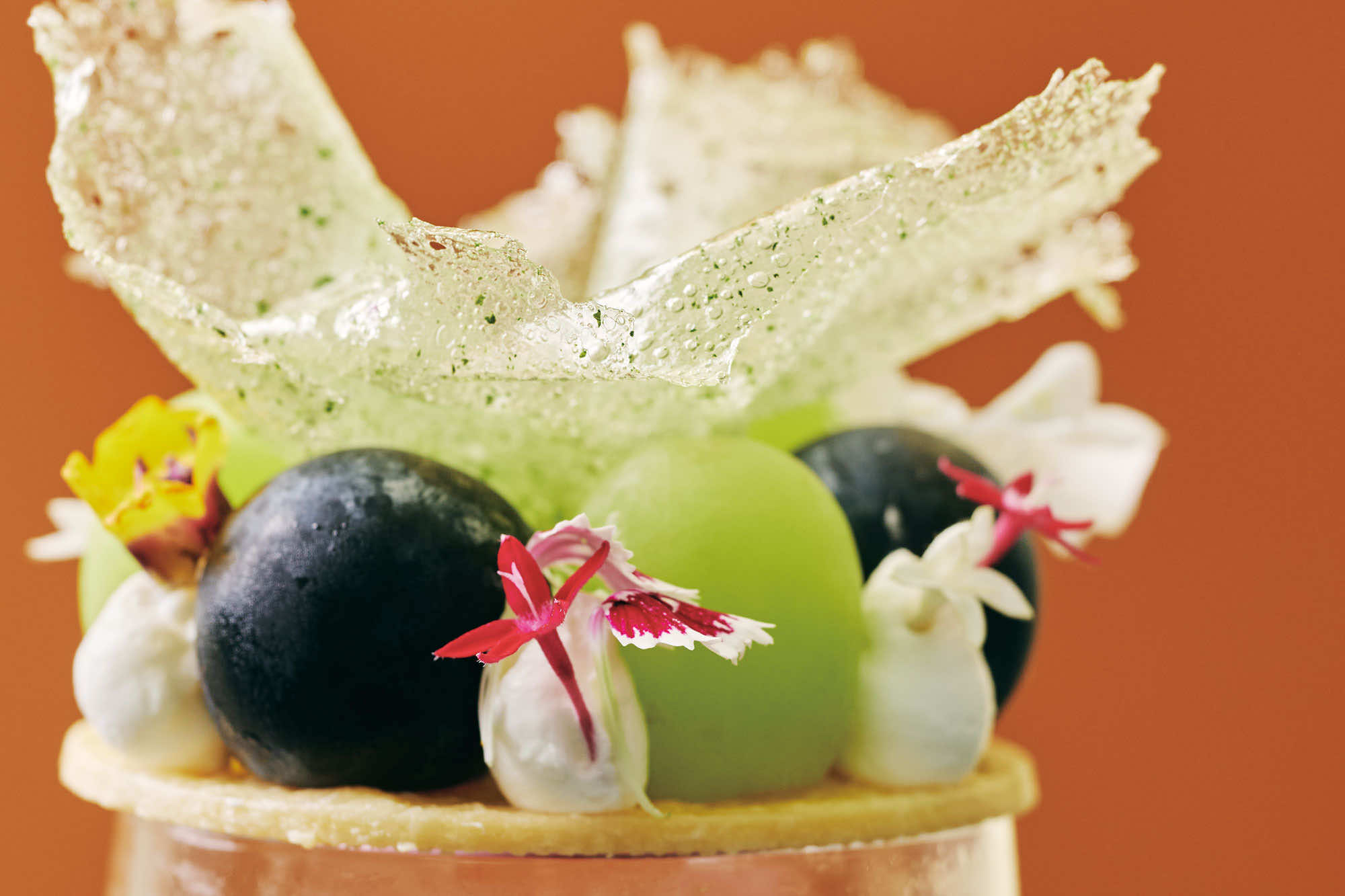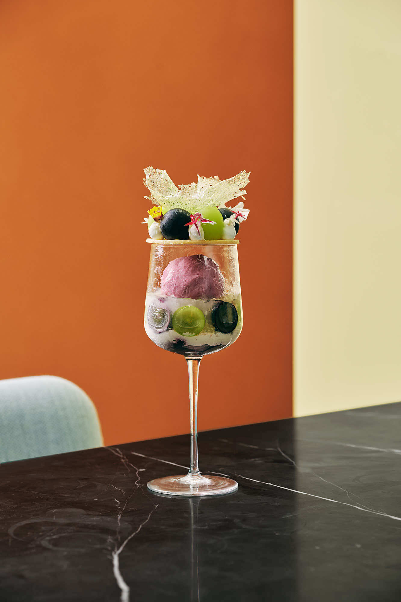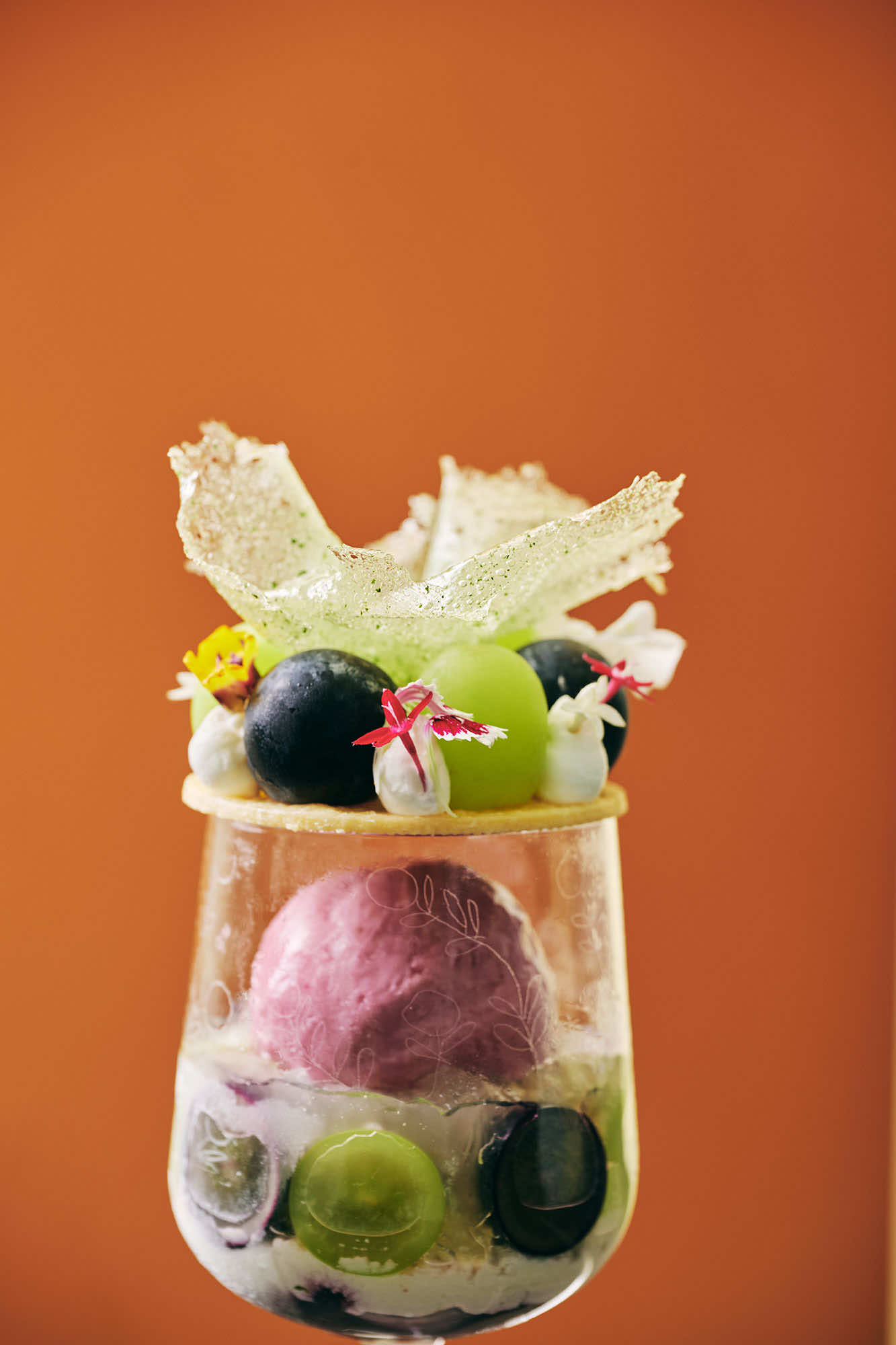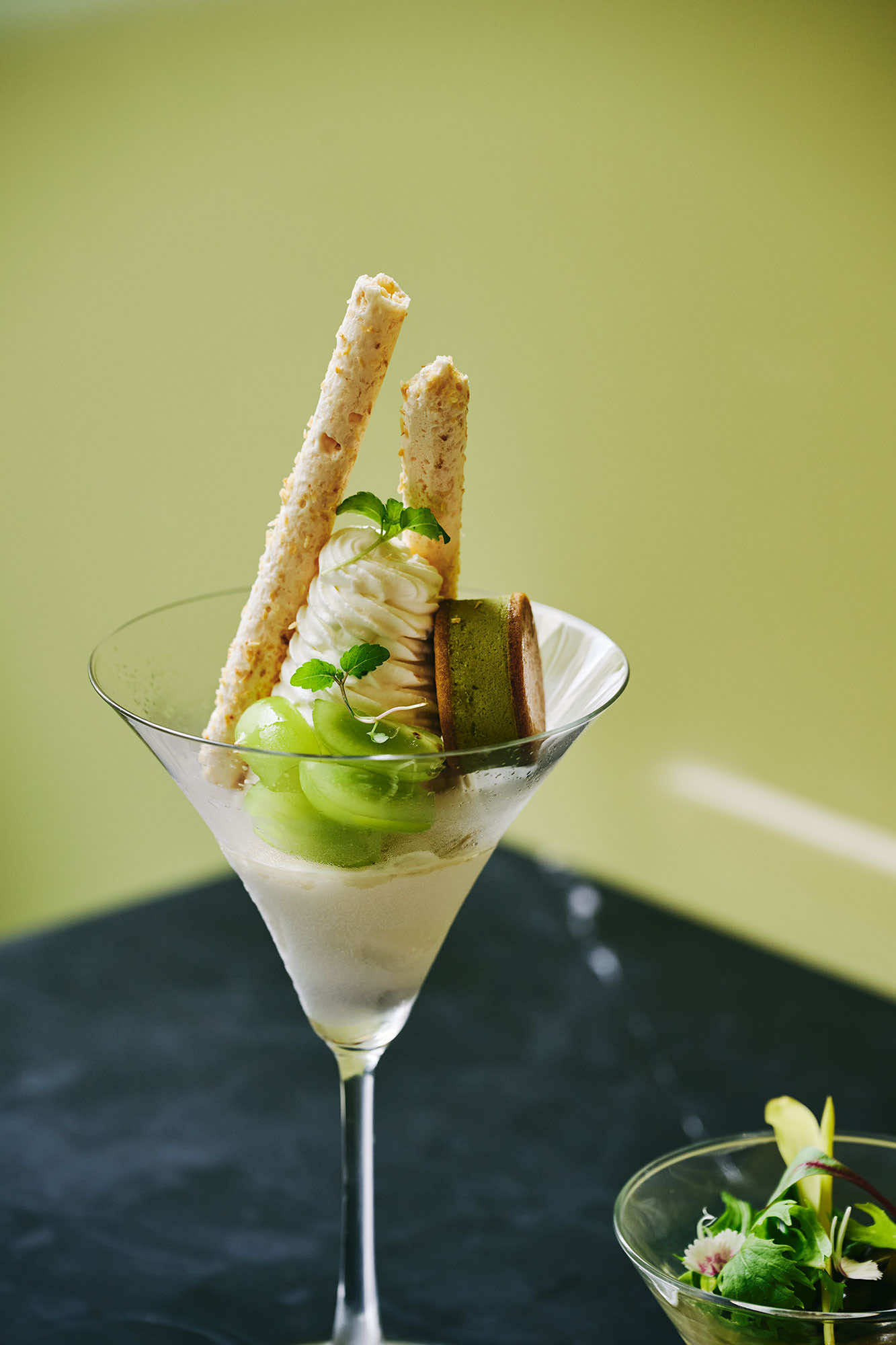 秋のメニュー「マルニ パフェ 葡萄」では、シャインマスカットや巨峰に、スダチやハーブ、ナッツを重ね、ブドウの魅力を引き立てる香りのレイヤーを表現。花束のように仕立てられたミント香る飴細工をトップに添えた、視覚的にもマルニらしい華やかさを演出しています。さらに、ブドウの奥から、まさかのモンブランクリームや栗はちみつブランマンジェが現れ、もう一つの旬の味覚の栗も堪能できます。