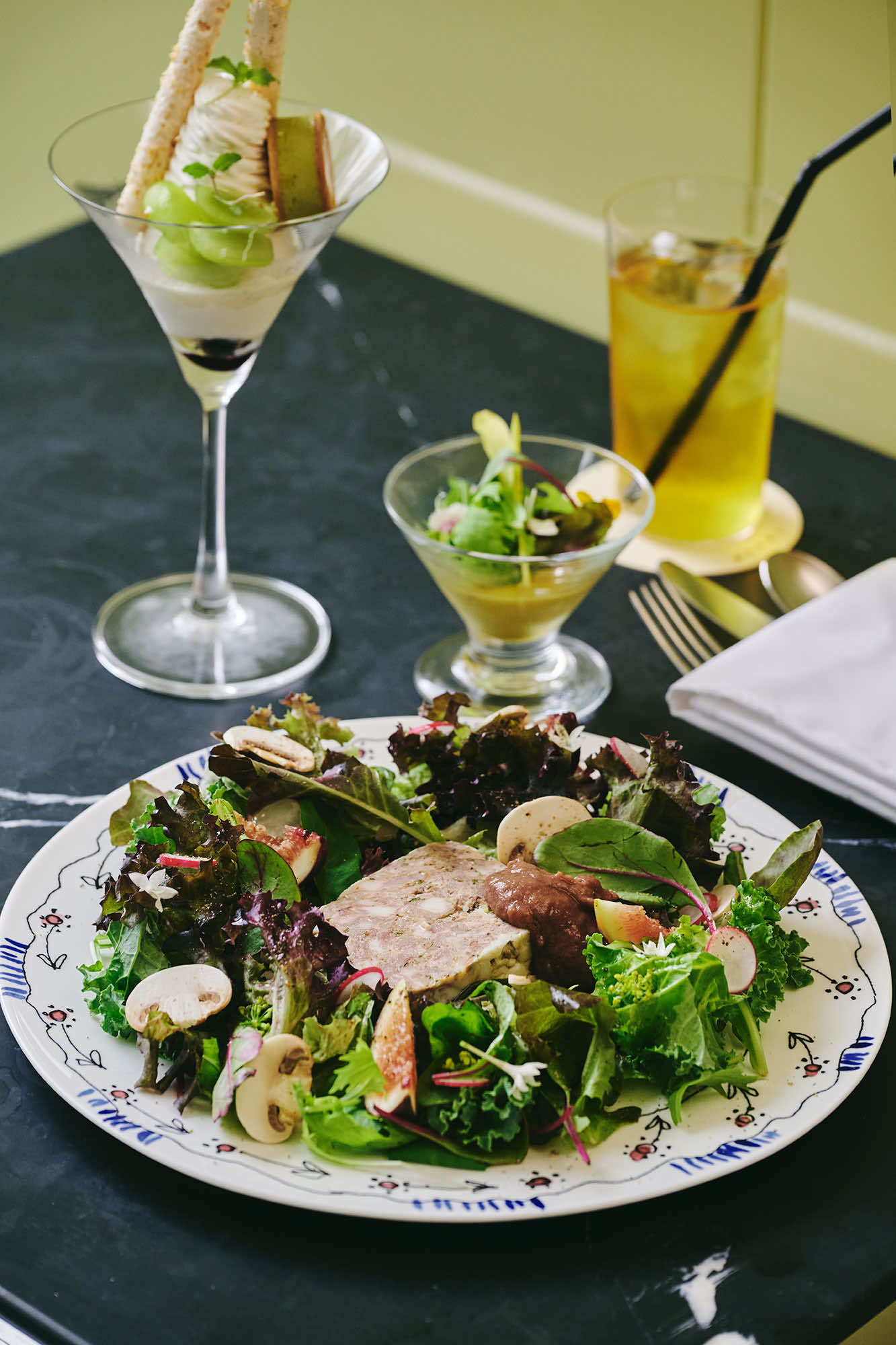 メインディッシュ、サイドディッシュ、デザートまで揃うフードメニューには、味わいの調和はもちろん、見た目のインパクトや物語性にも重点が置かれ、一貫した世界観が築かれています。「パテドカンパーニュと季節のフルーツリースサラダ」は、パテドカンパーニュの周りを花畑のように華やかなサラダが囲み、リゾットはビーツを用いてヴィヴィッドな色彩でマルニのデザイン感覚を表現。それぞれに異なる個性を持ちながらも、全体としての統一感まで考え尽くされた構成です。