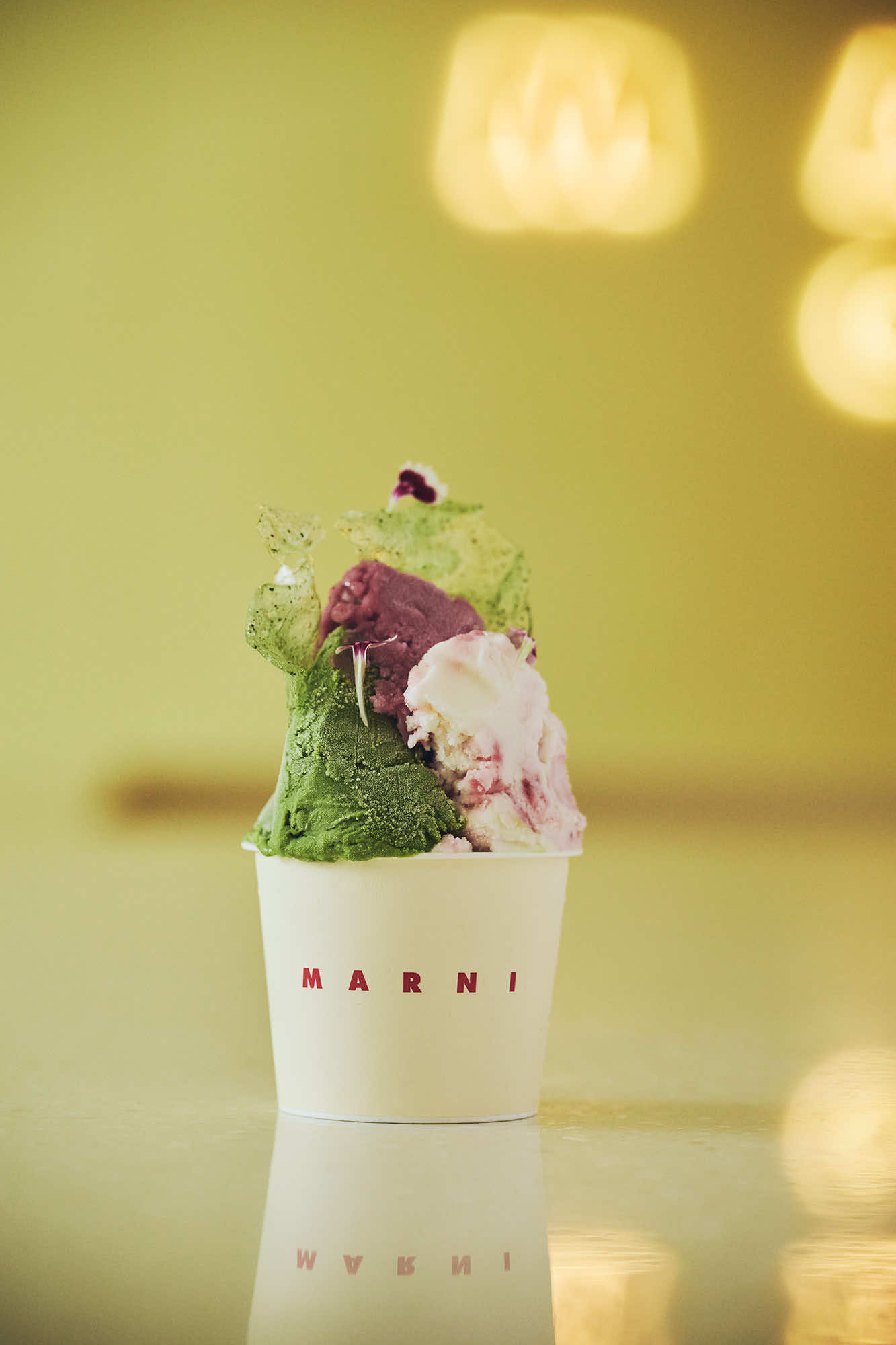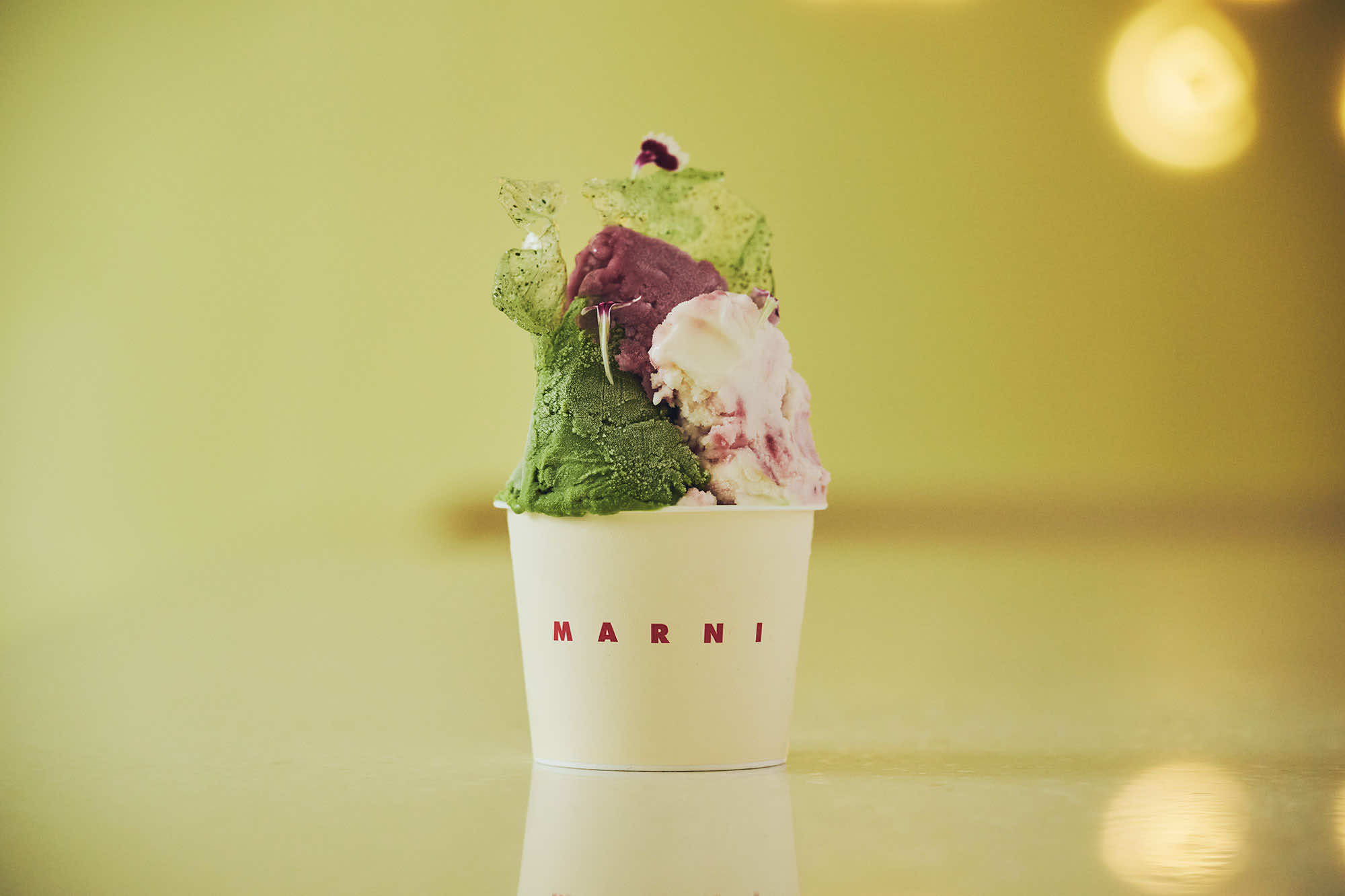 世界初のマルニ カフェを日本で展開するにあたり、マルニは日本人のパティシエである、アサコ イワヤナギとタッグを組みました。その理由は、マルニのフィロソフィともリンクする、彼女のアーティスティックな感性、既成概念に捉われない実験的なアプローチにあります。マルニの鮮やかで自由な色彩感覚と、アサコ イワナギの素材への探究心が響き合い、これまでにないケミストリーが生まれました。開発の過程ではマルニチームと何度も対話して意見を交わし、「マルニらしさ」を探りながらデザインを完成させたのだそう。