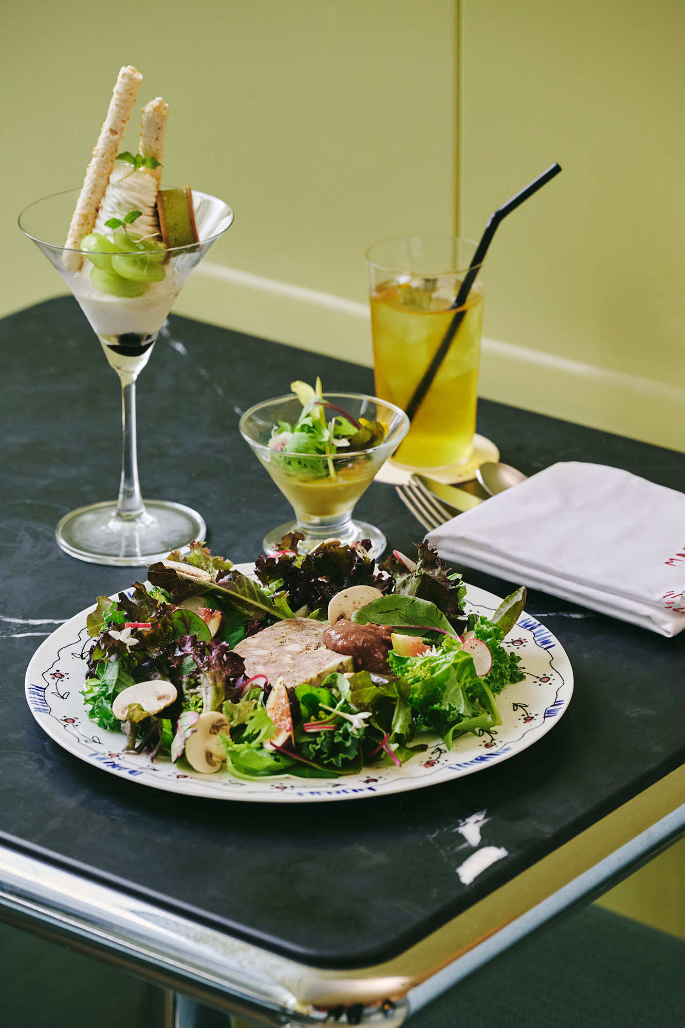 なかでも、オープンから14時までオーダーできるマルニ セットは、ブランチやランチタイムにおすすめの満足度の高いセットメニュー。ミニスープサラダの前菜から、選べるメインディッシュとデザート、食前、食後のドリンクに至るまで、食の流れ全体でブランド哲学を体現しています。また、追加料金でシグネチャーパフェに変更可能などのオプションもあり、カスタマイズできるのも魅力です。