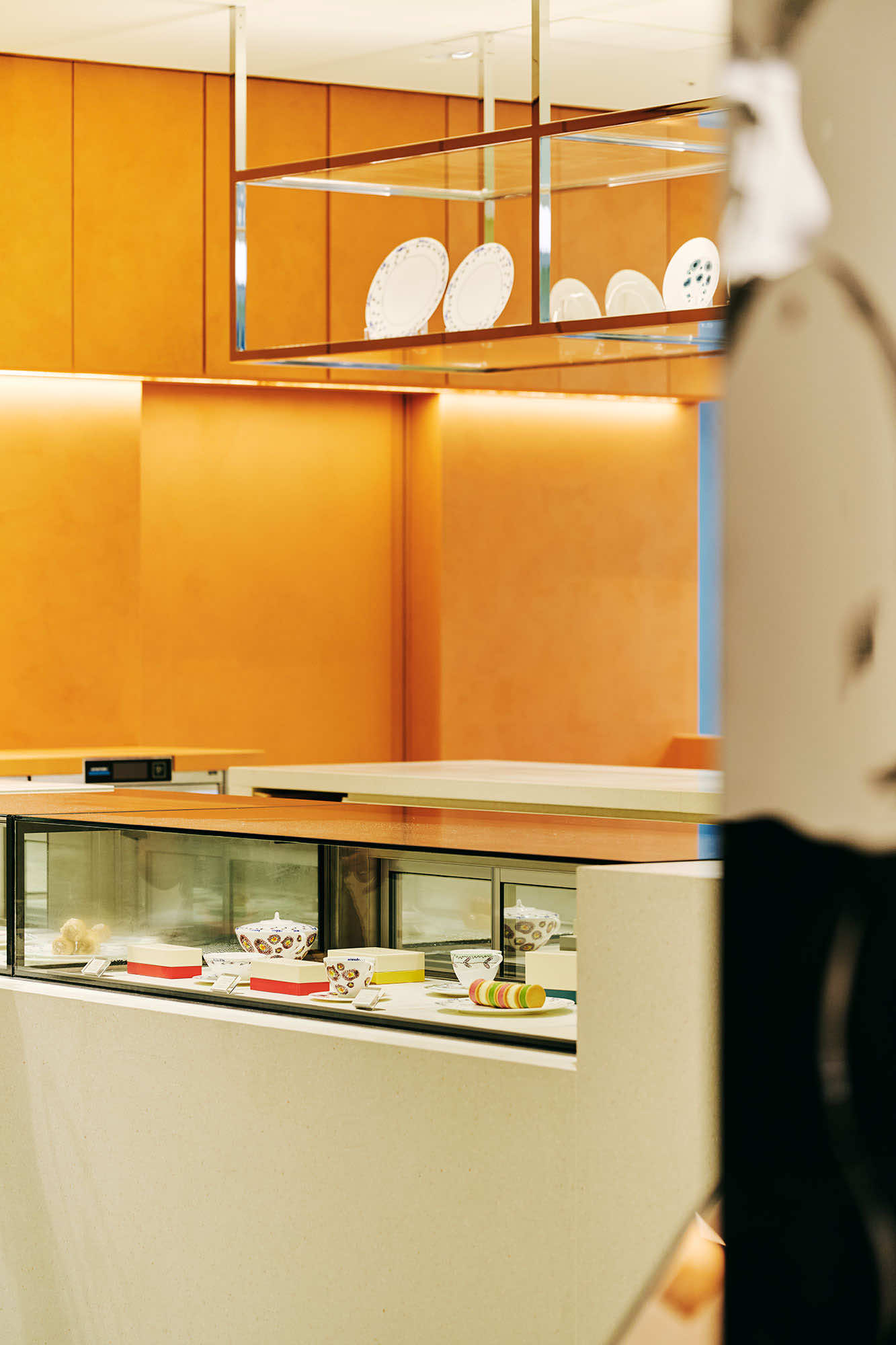マルニの感性は、インテリアにも反映されています。エントランスを縁取る波打つシルバーパネルのファサード、空間の中心に配したテラゾー製のアイランドカウンター、キッチンの鮮やかなテラコッタカラーの漆喰のマットな壁と、光沢のあるライムイエローの壁。鮮やかな色と柔らかなパステルトーンのカラーブロッキングが特徴的です。また、客席の什器にも注目。黒い大理石とポリッシュ仕上げのスチールのテーブル。脚元はマルニストアの什器にも共通する愛らしいペタルモチーフ。アクアマリンの生地で彩ったマルセル・ブロイヤーの名作チェスカチェアとともに、柔らかさとシャープさとのコントラストでモダンなインテリアを完成させます。色彩と素材を巧みに操るマルニのコレクションにも通じる空間です。