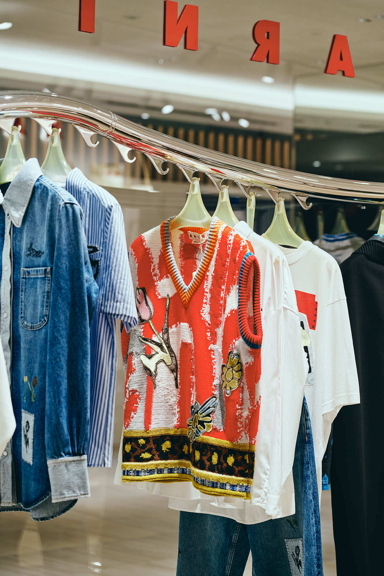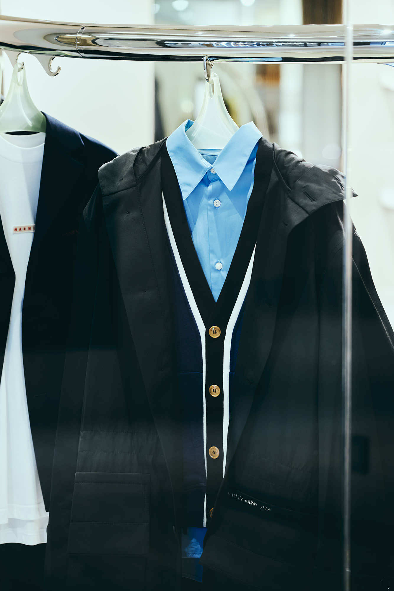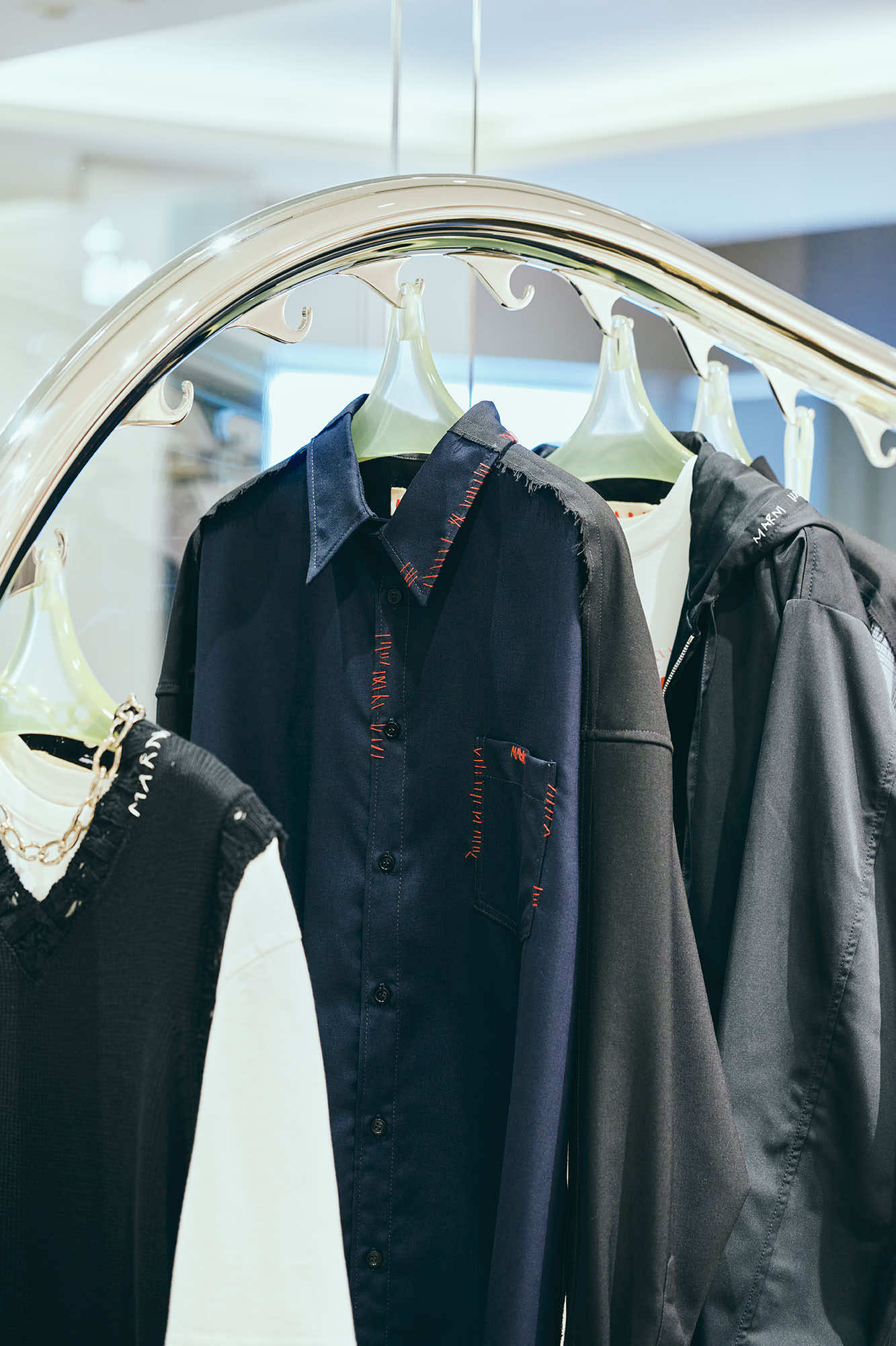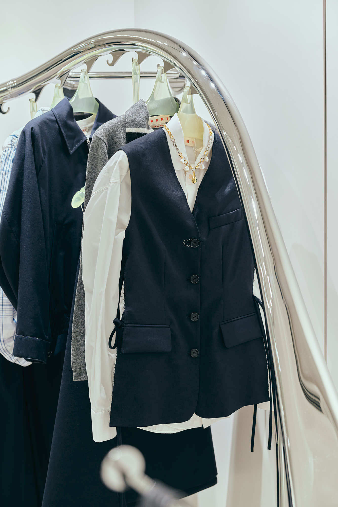マルニのフィロソフィを色濃く描き出すアーティスティックなコレクションだけでなく、店頭では、マルニらしい素材使いや加工、手仕事にこだわった、エッセンシャルなワードローブも充実しています。カーディガンやベストといったベーシックアイテムには、ハンドステッチ、メンディングのロゴパッチやボタンホールなど、アイコニックなデザインディテールが取り入れられています。シンプルなシアリングノーカラージレは、ふんわりとカットされた柔らかな毛触りと丸みのあるシルエットが印象的。マルニのDNAを反映した上質なクラフツマンシップを感じさせます。