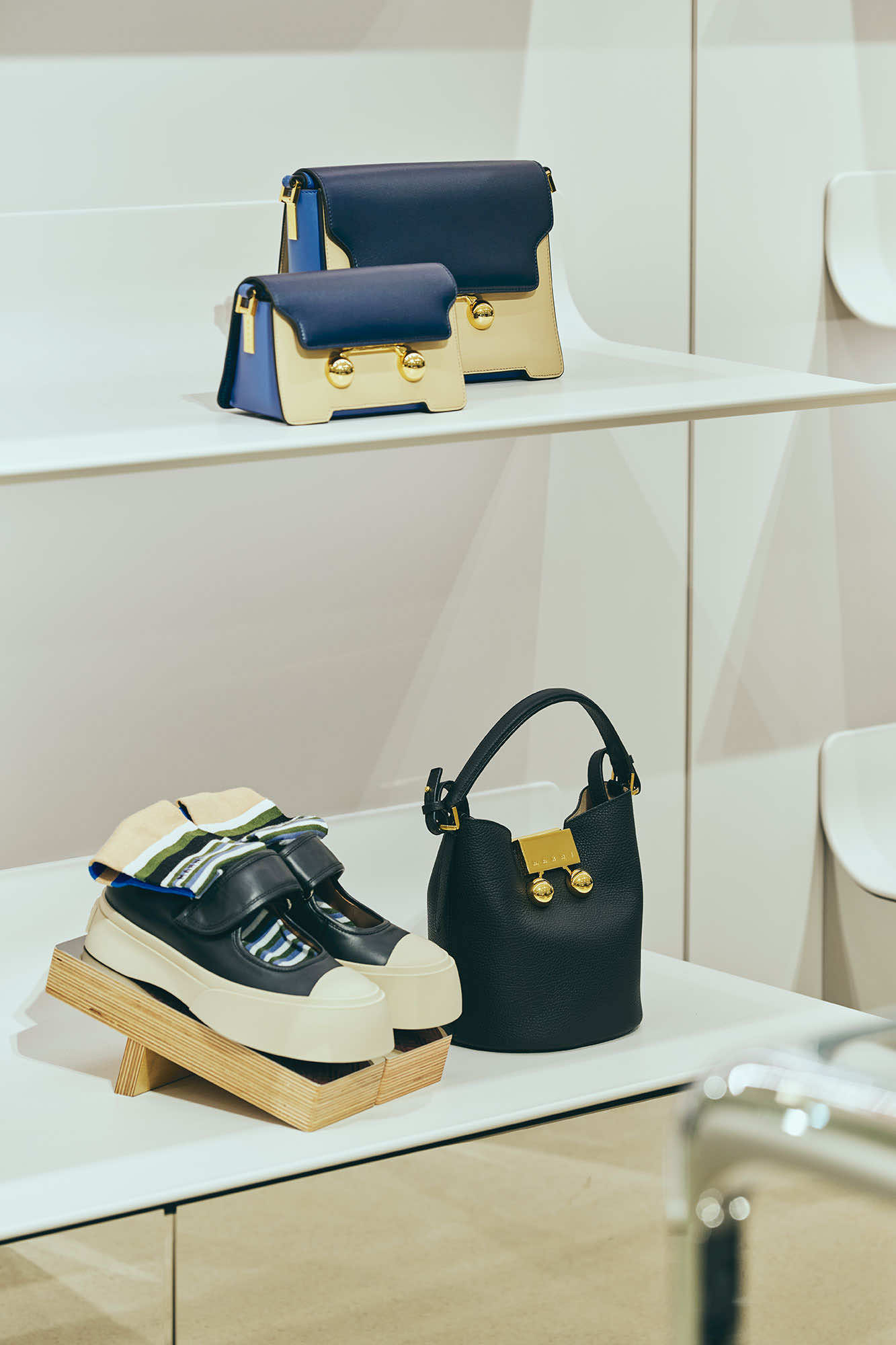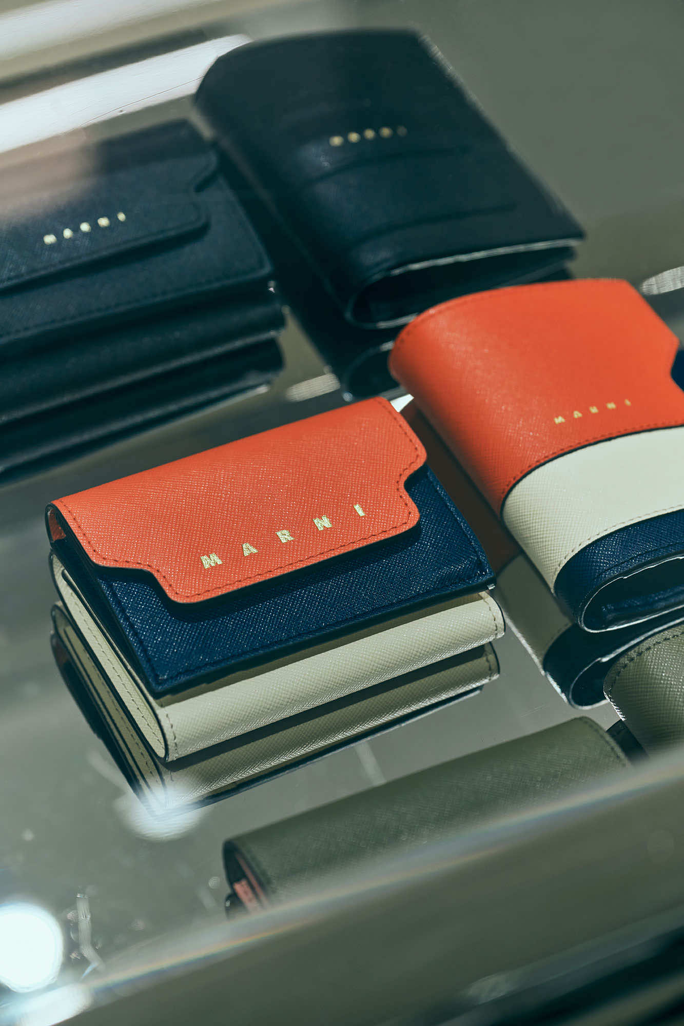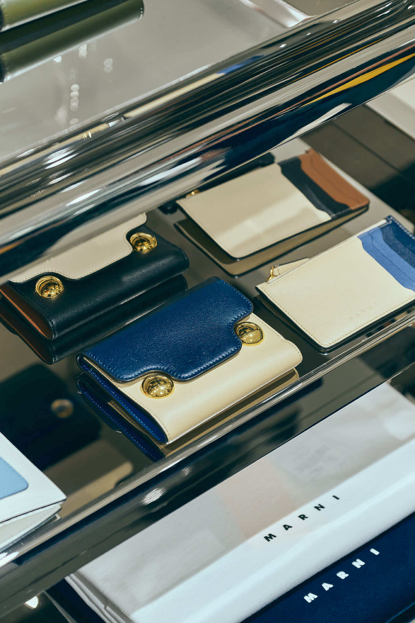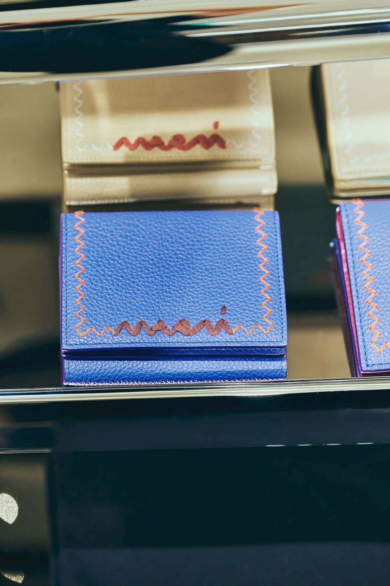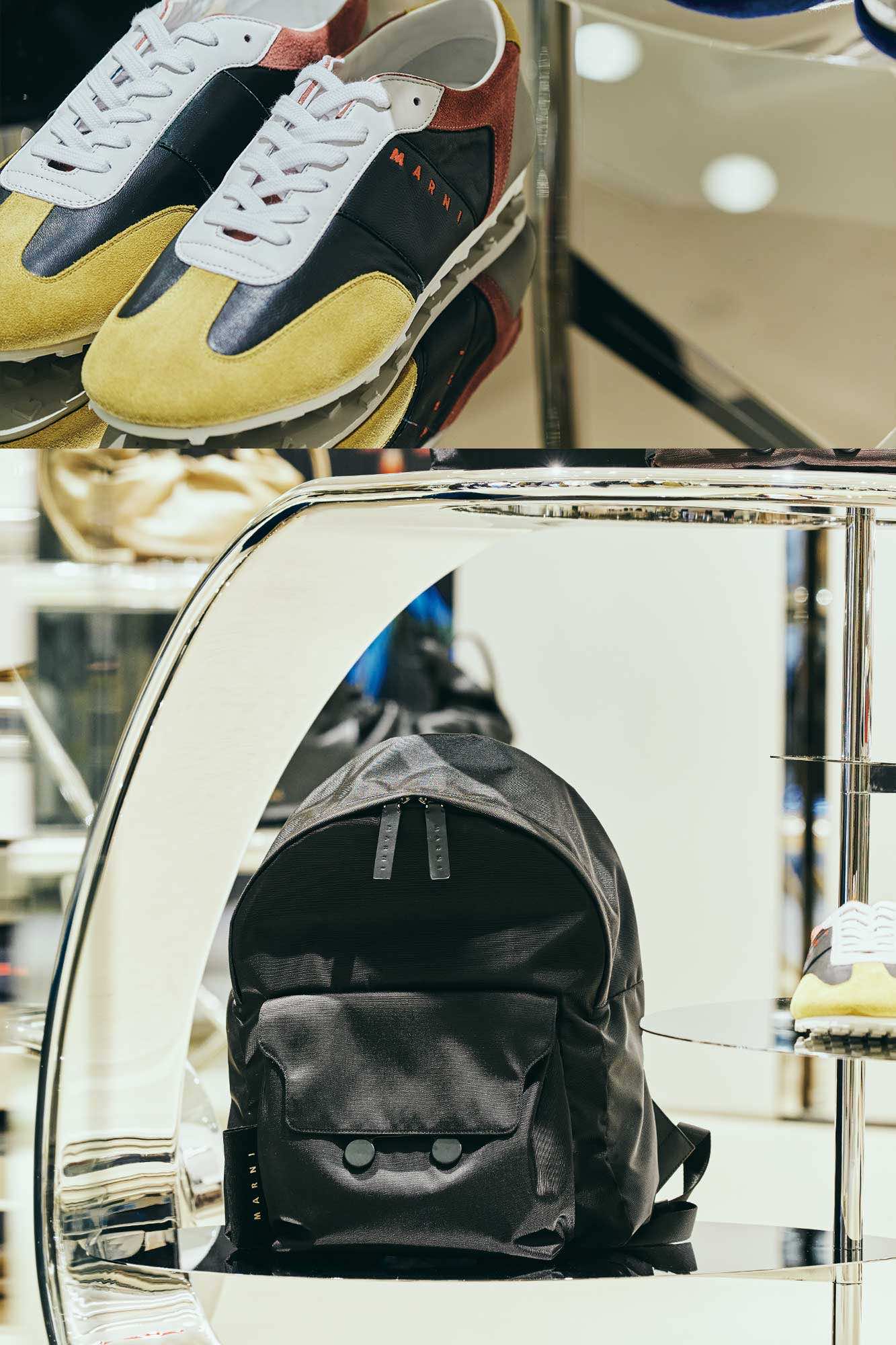 そして、ギフトにも人気の高いスモールレザーグッズにも、マルニの色彩の感性で表現したマルチカラーが印象的な「トランク」ウォレット、「トランカルー」のスタッズを大胆に配したウォレットといったアイコンバッグのデザインが落とし込まれています。他にも波のようなシンボルロゴをハンドステッチで表現した「SYMBOL(シンボル)」シリーズなどをラインナップ。バッグ、シューズ、スモールレザーグッズにも、マルニらしいクリエイティビティが表れています。
