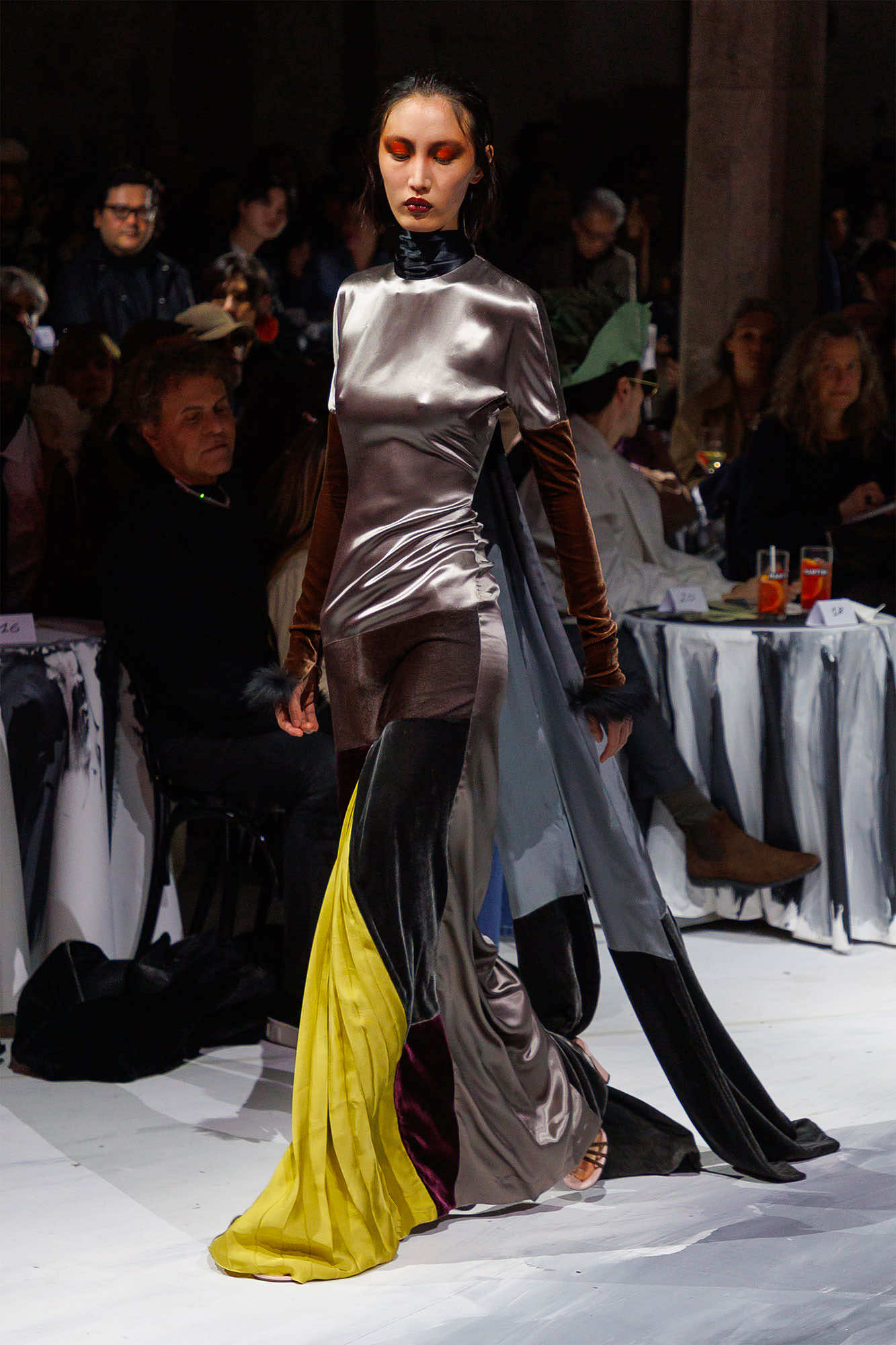 2025年秋冬コレクションは、フランチェスコ・リッソがロンドンのパブで出会った2人のアーティスト、オラオル・スローンとソルジャー・ボーイフレンドとのセッションによって生まれました。コレクションの準備にあたり、まず約1カ月の間、3人はアーティストレジデンスで共に制作を行ったのだそう。そこでの制作の成果は、2025年2月にミラノで発表されたコレクションのランウェイの背景となった大型キャンバスに具現化され、プリントやモチーフ使い、刺繍という形でコレクション全体に派生。マルニらしいアートとファッションの密接な結びつきを確固たるものにしました。