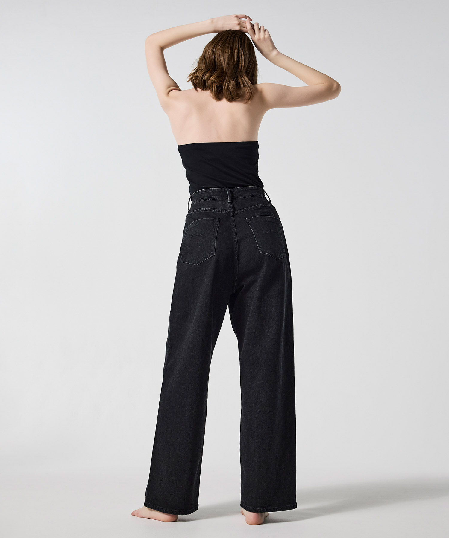メンズライクな印象を演出するため、股ぐりを長めに設定し、ヨーク幅やバックポケットを大きめのデザインに作成。ハイウエストなのでジャストフィットで履いていただくのがおすすめです。