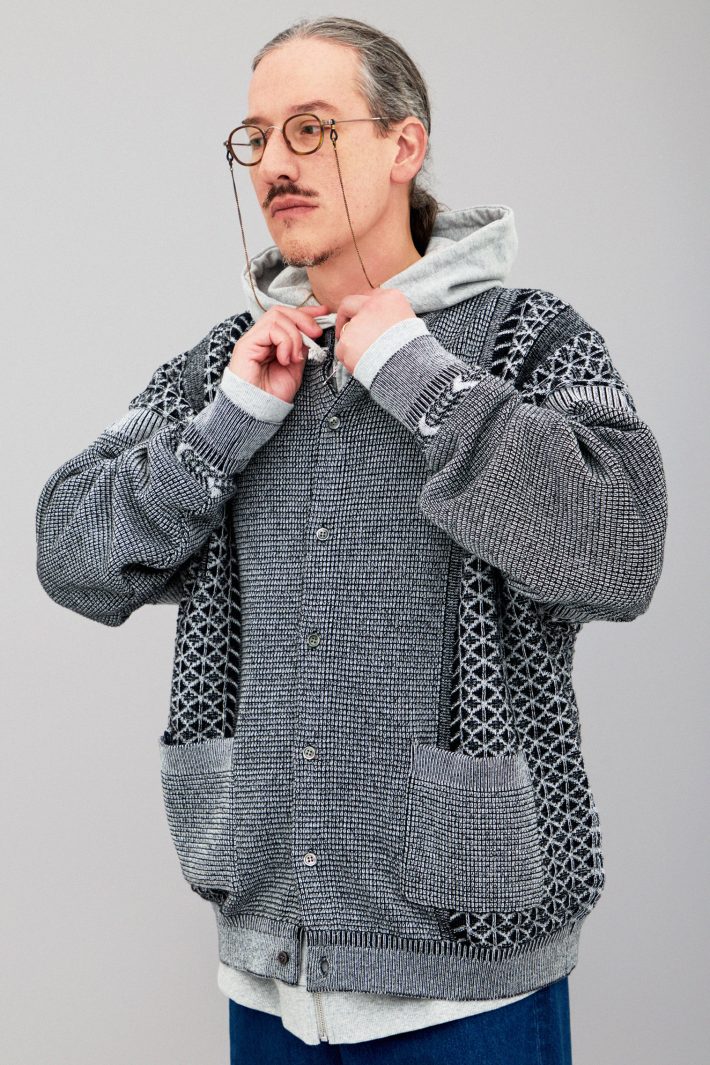 YASHIKI定番のクルーネックカーディガンです。ひらひらと舞い落ち、あたり一面を柔らかく包んでゆく雪をイメージしました。身頃脇の柄は雪の結晶を表し、身頃中央を袖のワッフル柄で雪に包まれた田畑や家を表しています。表側と裏側の糸色に濃淡をつけることで奥行きを出し、雪がゆっくりと積もっていく様を表現しています。着用時に肩が落ちて柔らかな印象になる様にYASHIKIでは定番となった着物のパターンをオマージュして仕上げています。