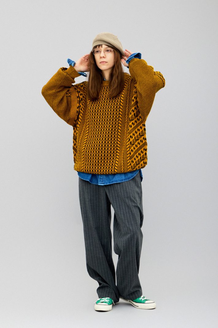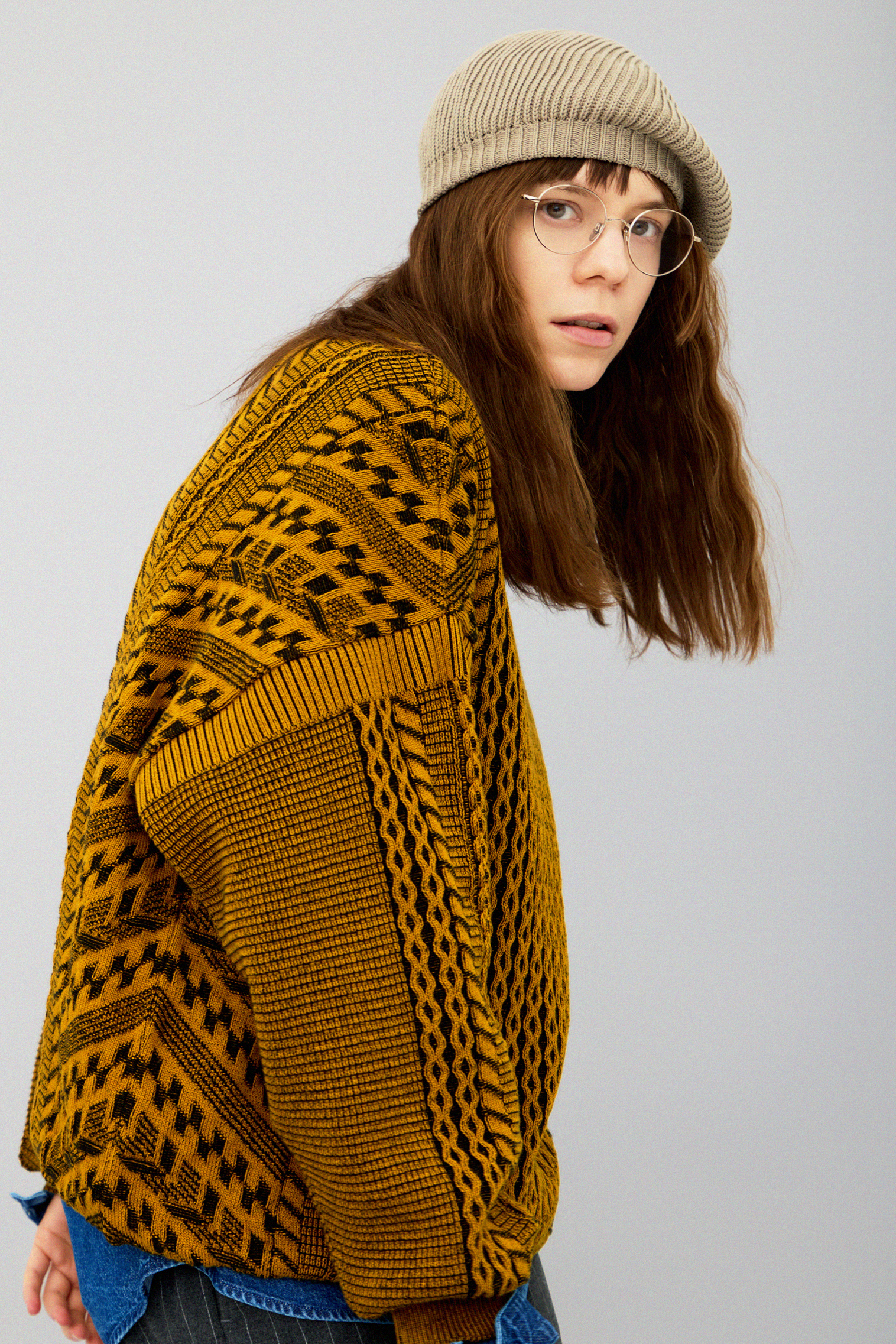 ブレーティング編みと言われる表目側と裏目側で異なる糸を編む技法を使用し、表と裏で糸の色を変えて、2色で編むことで奥行きのある表情に仕上げました。着用時に肩が落ちて柔らかな印象になる様にYASHIKIでは定番となった着物のパターンをオマージュして仕上げています。袖口にはブランドアイコンの[矢絣]柄が入ります。