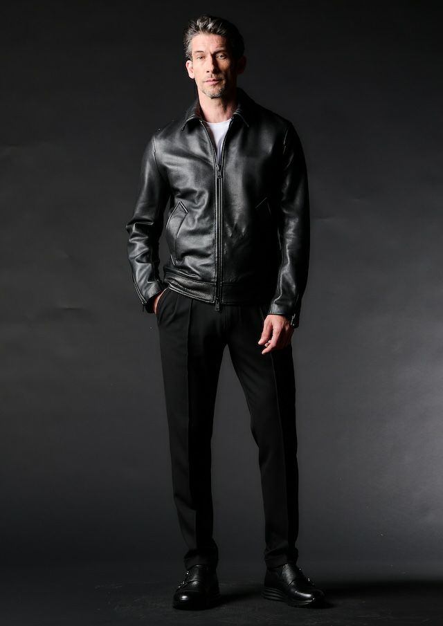 ヴィンテージのトラッカージャケットをベースに、徹底的にミニマルへと昇華させた一着です。オールブラックで統一されたシンプルなデザインに、希少な鹿革(ディアレザー)が放つ野性味を融合しました。