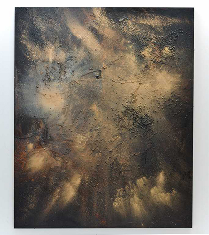 《根が地獄まで届く》1620mm × 1303mm、木に蜜蝋、伊予砥石、漆、顔料、花粉(2025)