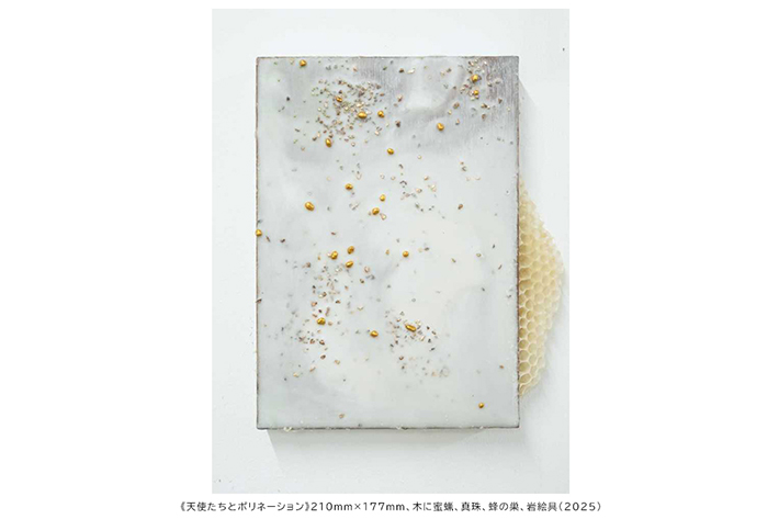 團上は、絵画、立体、詩、ソーシャルプロジェクトなど。蜂の巣を素材に、蜜蜂と人類の古代からの関係を主題とする作品の制作を通じて、私たちの生と環境の再接続と治癒を探る。