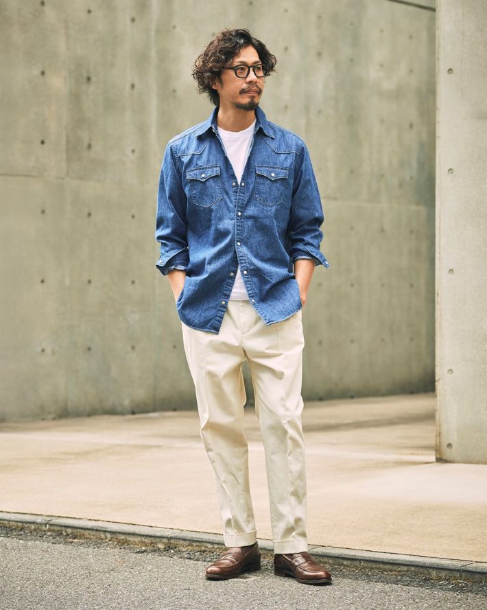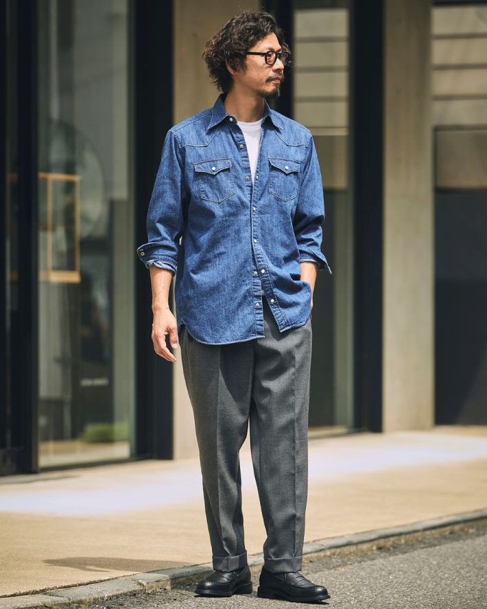 「ヨークやポケット、パールボタンなどの意匠が効いたウエスタンシャツは、一枚で着映えるのが大きな魅力。さらに『リバプール』ならではの特徴として、裾をタックアウトしても着られるよう丈や身幅を計算している点に注目。このようにオーバーシャツとして使うこともできるんです。着回しの幅もグッと広がりますよ」