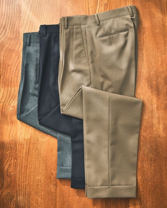 「ポーツマス」。定番のグレーウール(左端)に加えて、今季はウールポリエステルのトロピカル素材が登場します。「定番グレーパンツの雰囲気が好評をいただいているので、その路線でバリエーションを……と考えて選んだ素材です。適度にハリのあるヴィンテージテイストな風合いで、トープ・ネイビーともにミリタリーを象徴する色。グレーと同様、さまざまな装いにマッチします。真夏以外は通年着用可能。機能面も優れています」