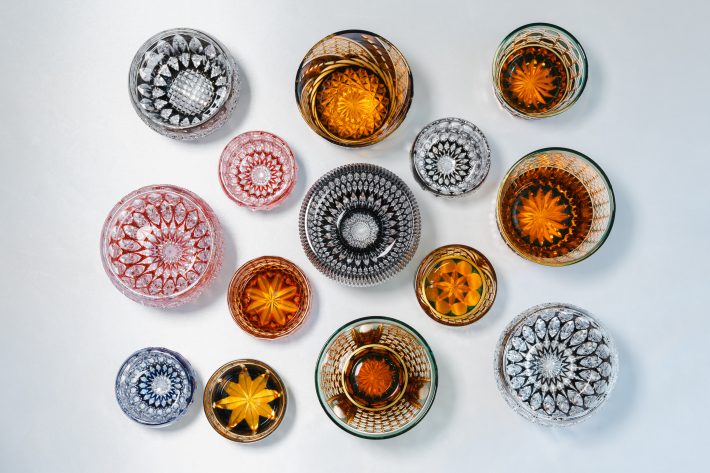 明治九年(1876年)、アイスクリームやジャムなどと共に洋食器が日本に広まっていく中、国はガラスの産業化を目指し、品川へ製造所を整えます。英国から四人の技術者を招き、十数人の職人が師事。特に、指導者のボヘミア地方(現在のチェコ)にルーツを持つ彼の指導を手本に、日本の代表的な和柄である麻の葉模様や七宝文などを取り組み、この国ながらのデザインを作り上げたのです。和洋のデザインの巧みさに融合された美しさは人々を魅了し、大正の頃には、日用品としての地位を確立していきます。