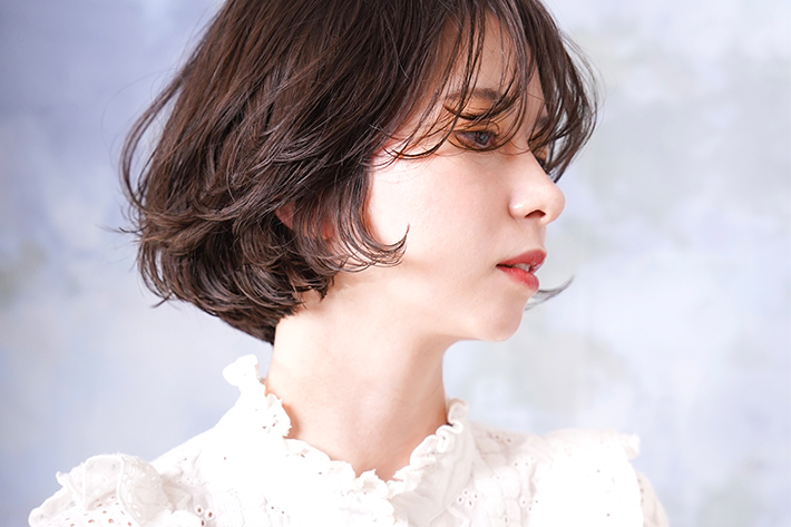 首元が隠れると重く見えがちなボブスタイルをこの秋は襟足ギリギリの長さから前上がりに切ってイメージチェンジ。