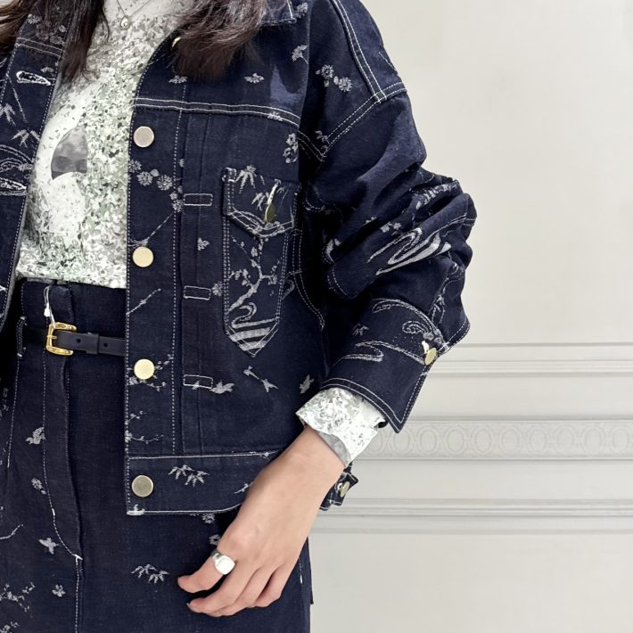 琉球漆器や琉球織物をインスピレーションにしたオリジナル花鳥柄をジャカードで表現したデニムジャケットです。ショート丈のシルエットと丸みのある袖の曲線が柔らかい印象を生み、ゆとりのあるサイズ感によりカジュアルさと上品さの絶妙なバランスを実現しています。すっきりとしたAラインのシルエットにアシンメトリーの花鳥柄を配し、センタースリットで足捌きを軽やかに。ポケット口は手の甲に沿う緩やかなカーブを描き、細部まで計算された立体感と上品な華やぎを演出します。