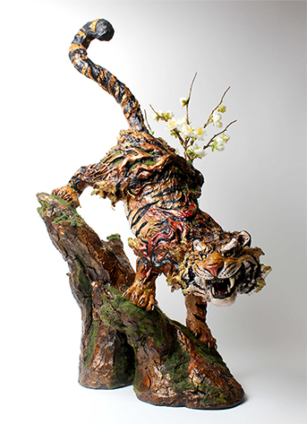 山羊蔵は、石粉粘土や樹脂、繊維などの様々な素材を用いて、動物や植物が混然一体となった作品を制作するアーティストです。粘土やアクリルガッシュなどを用いて作られるその作品は、複雑な形、テクスチャー、色彩であり、時に本物の動植物を越えた生命力を感じさせます。