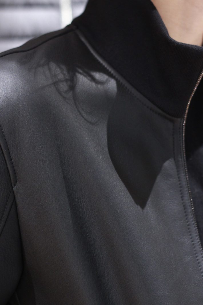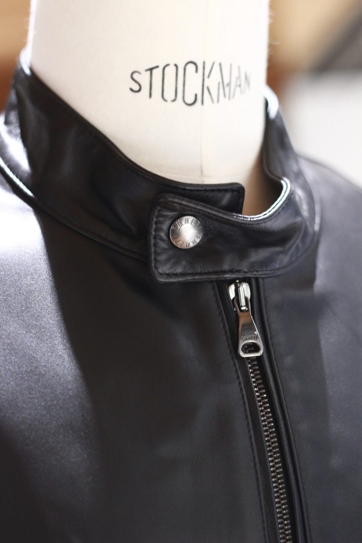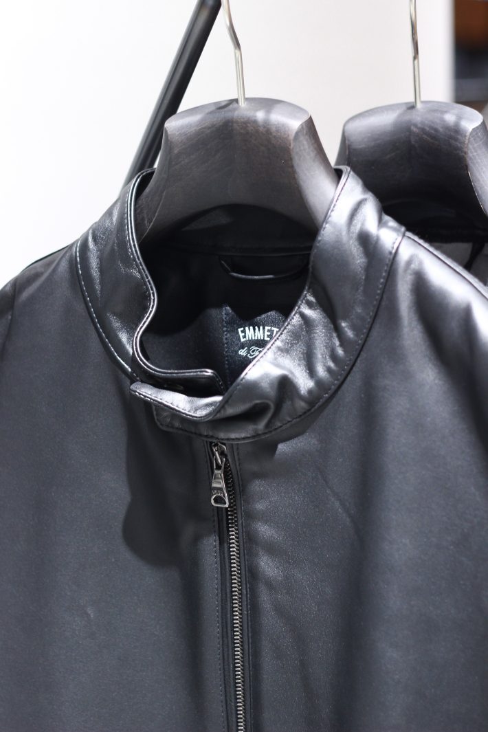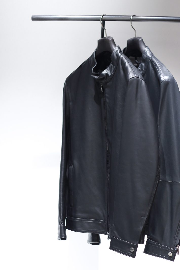 続いては、EMMETIの代表作「JURI(ユーリ)」をベースにPARIGOTが別注した特別仕様「JURI 190RIBA」。ブランド定番のシングルライダースより着丈を長く、袖を短くすることで都会的でスマートな印象にアップデートされています。サイズ展開も国内最大54サイズまでお取り扱いございます。すっきりした通常のライダースよりも更にアウターライクに着用可能な1着。使用されるレザーは、イタリア・トスカーナ地方で鞣された高級ラムナッパレザー。非常に柔らかく、手触りはしっとりと吸い付くようです。