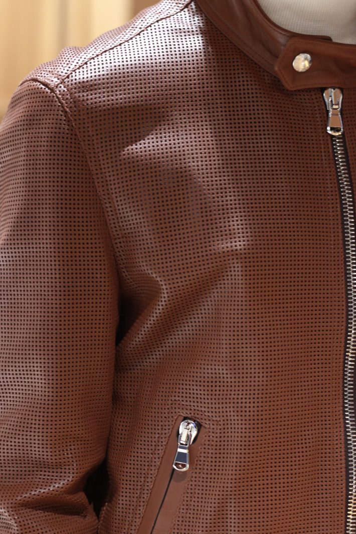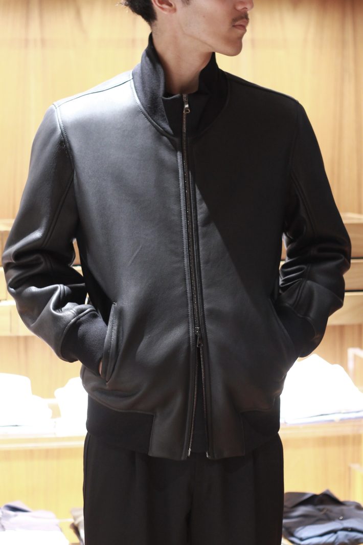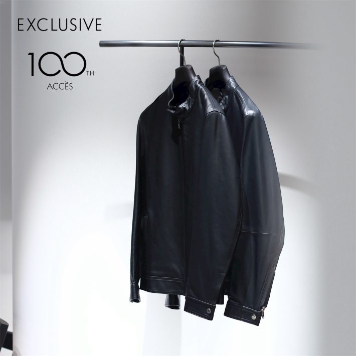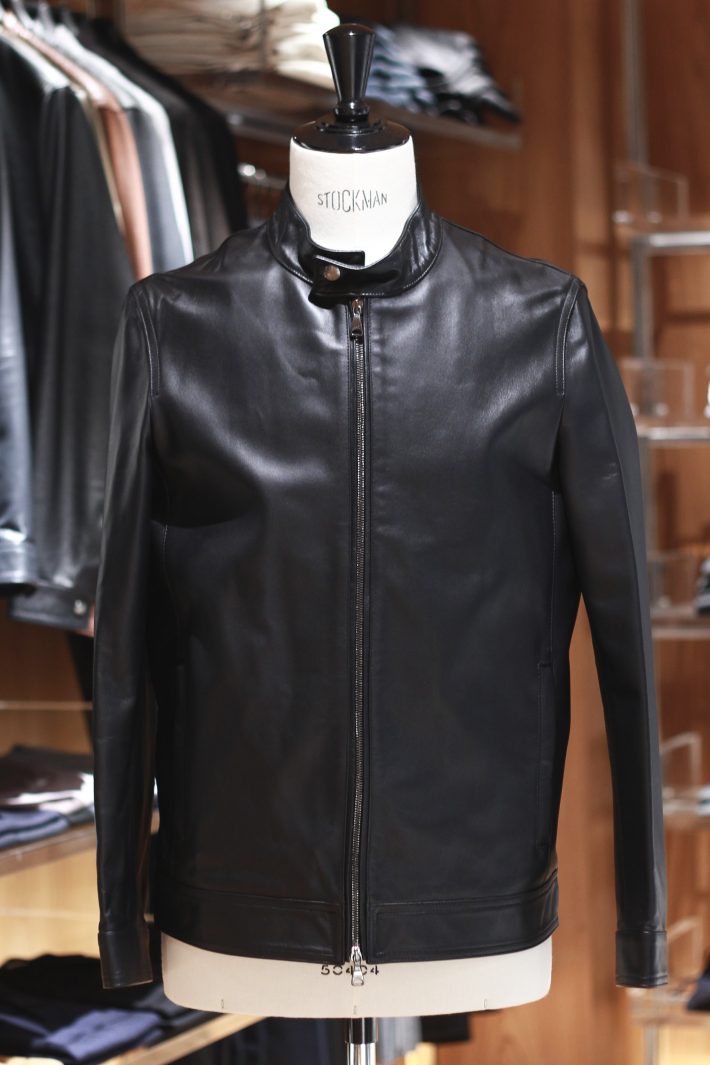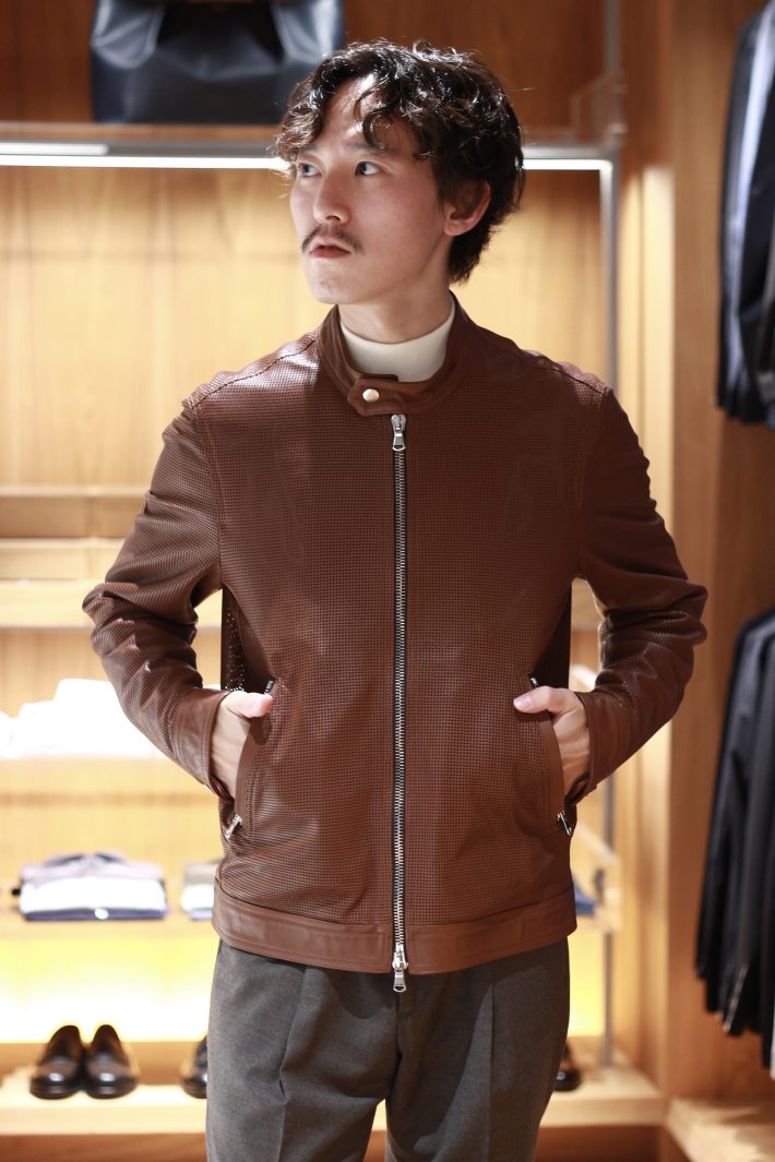 最初に紹介するのは、人気スタイリスト干場義雅氏監修による「H CLASSICA PUNCHING」。EMMETIの名作「MASSIMO」をベースに、よりクラシックで構築的なシルエットを追求した別注モデルです。最大の特徴は、四角型のパンチング加工を施したラムレザー。通気性を高めるだけでなく、レザー特有の重さを軽減し、春秋を中心に長く快適に着られる仕様になっています。
