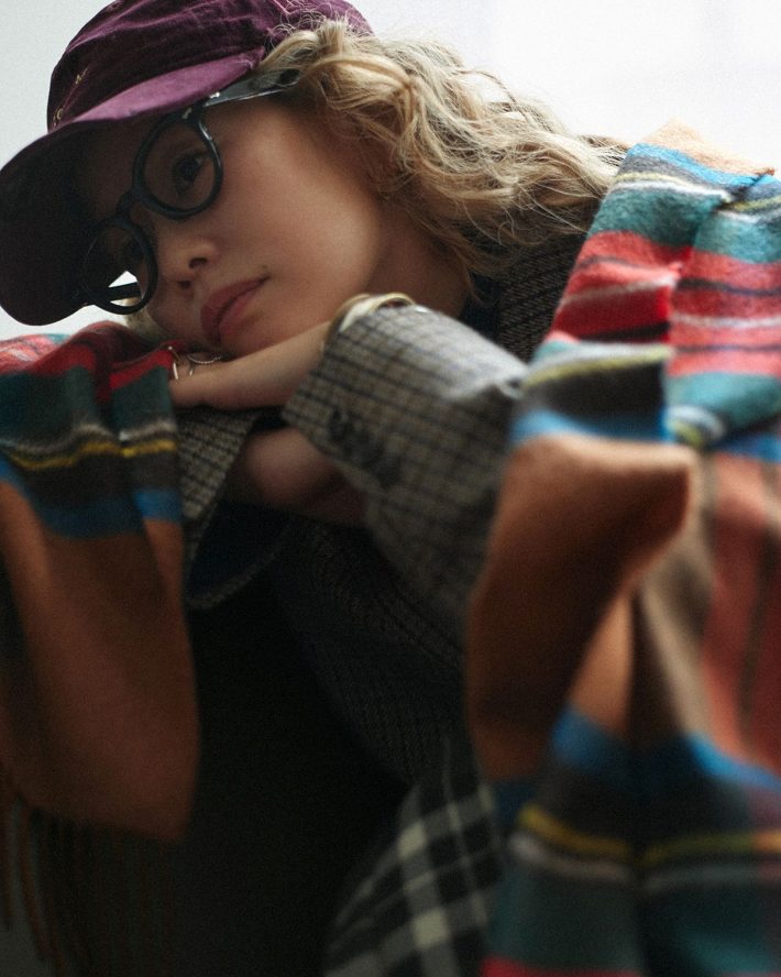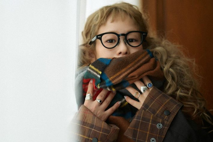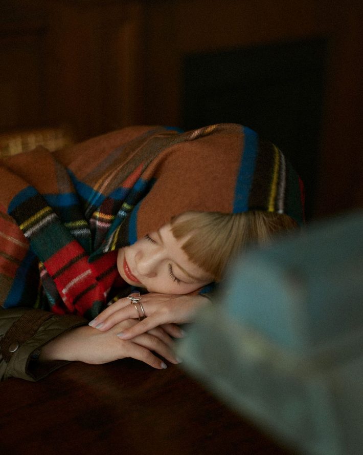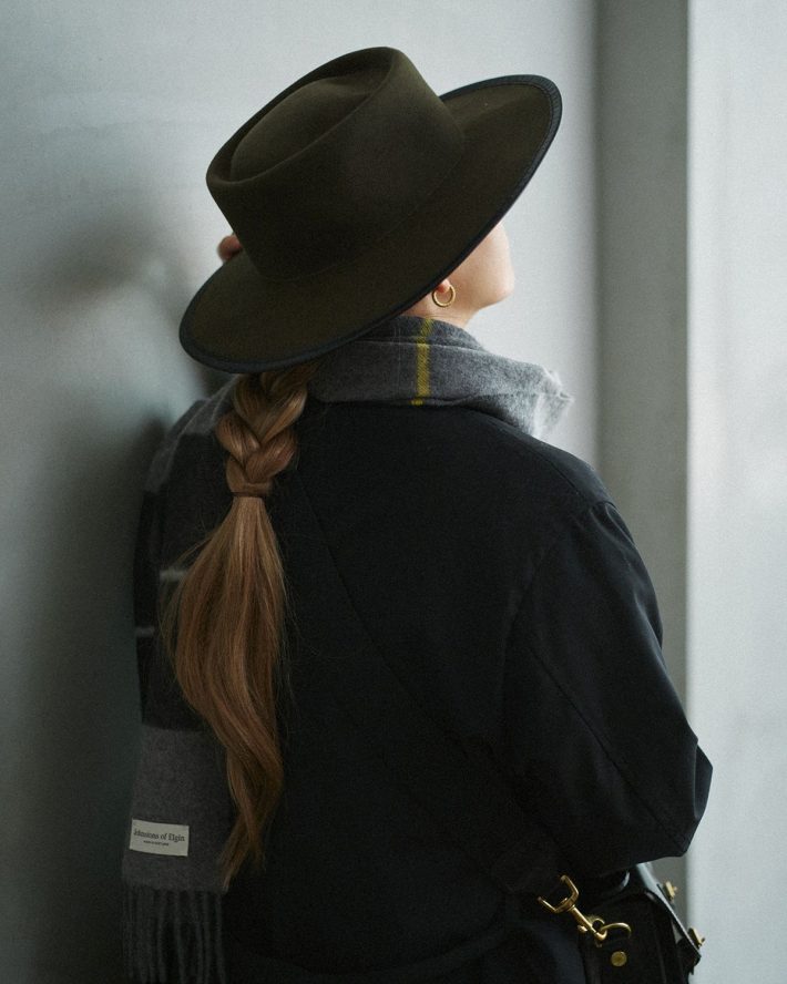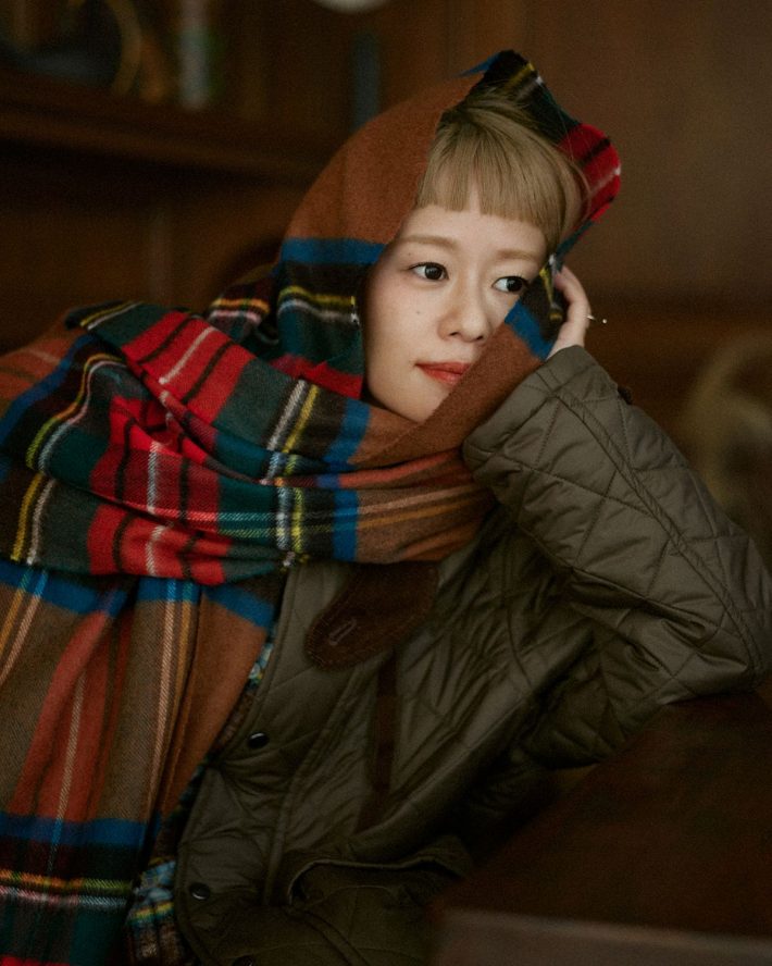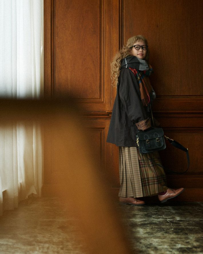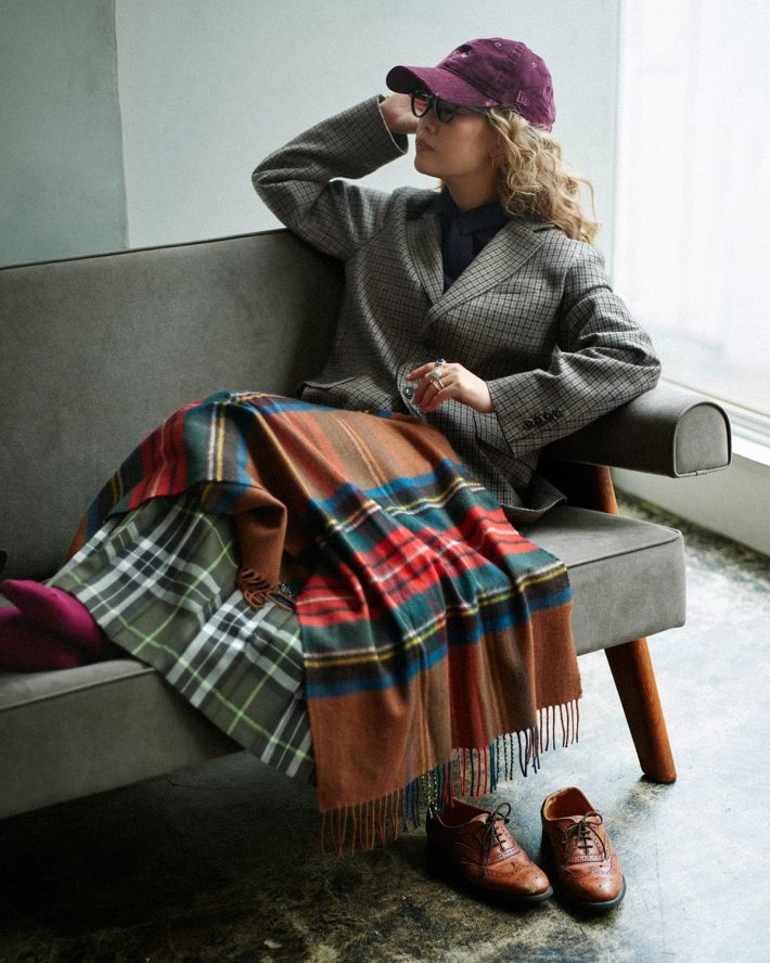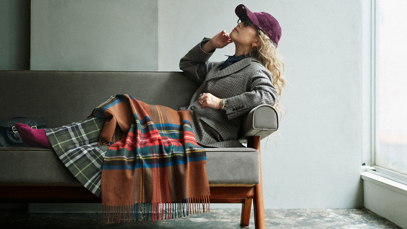 チェックジャケットとプリーツスカートに、シャツの襟元やストールでほんの少しの遊び心を添えて。ブラウンレザーのシューズで全体を引き締め、キャップとロングのクルクル金髪が、伝統と今とを自然に繋ぐムードを意識しています。