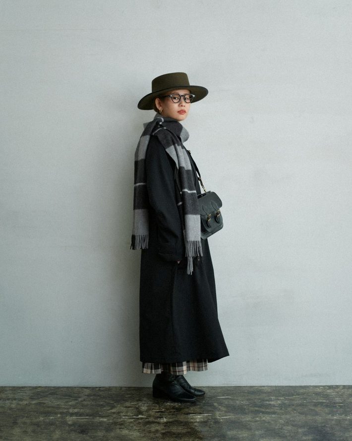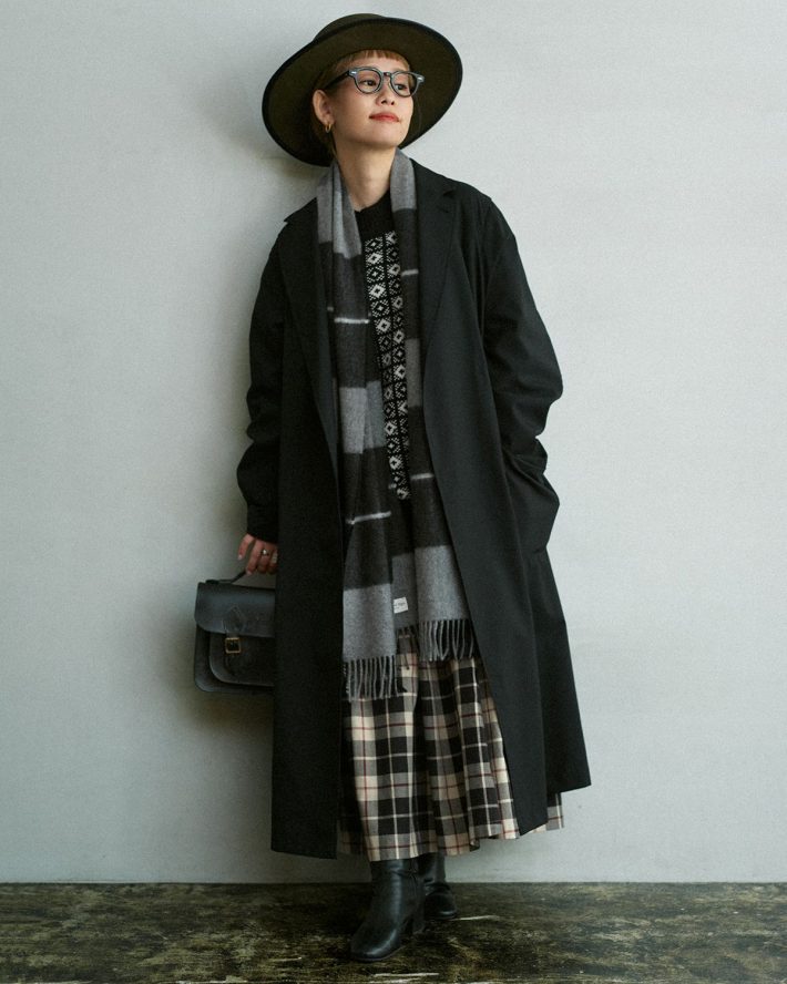 異なるパターンを掛け合わせながらも、色味を揃えることで統一感を出し、クールでハンサムな印象に。ストールで縦のラインがすっきりとしたシルエットを演出し、どこかモードな雰囲気も漂うスタイルです。
