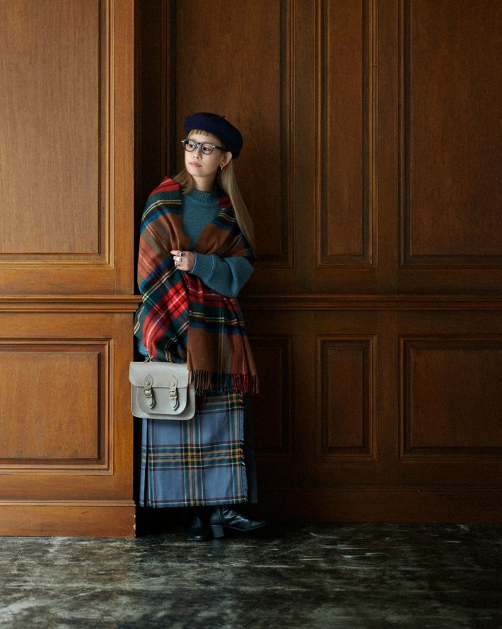 メンズの淡いブルーセーターとチェック柄のキルトスカートを合わせ、程よくクラシカルで柔らかな印象にまとめました。多色使いのストールが全体に温かみと奥行きを加え、シンプルになりがちな冬の装いに華やかさをプラスします。柔らかいトープのバッグでバランスよく合わせます。