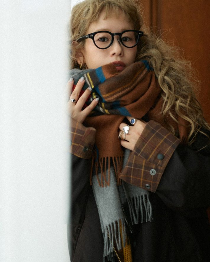 オフの日にカフェでゆったり過ごすイメージにぴったりのスタイル。ブラウンを基調にした落ち着いた装いで、ゆるっとしたオーバーサイズのバブアーが無骨さの中に女性らしい抜け感をプラス。首元にはモノトーンとブラウン系のストールをアフガン巻きで重ね、冬らしいボリューム感です。