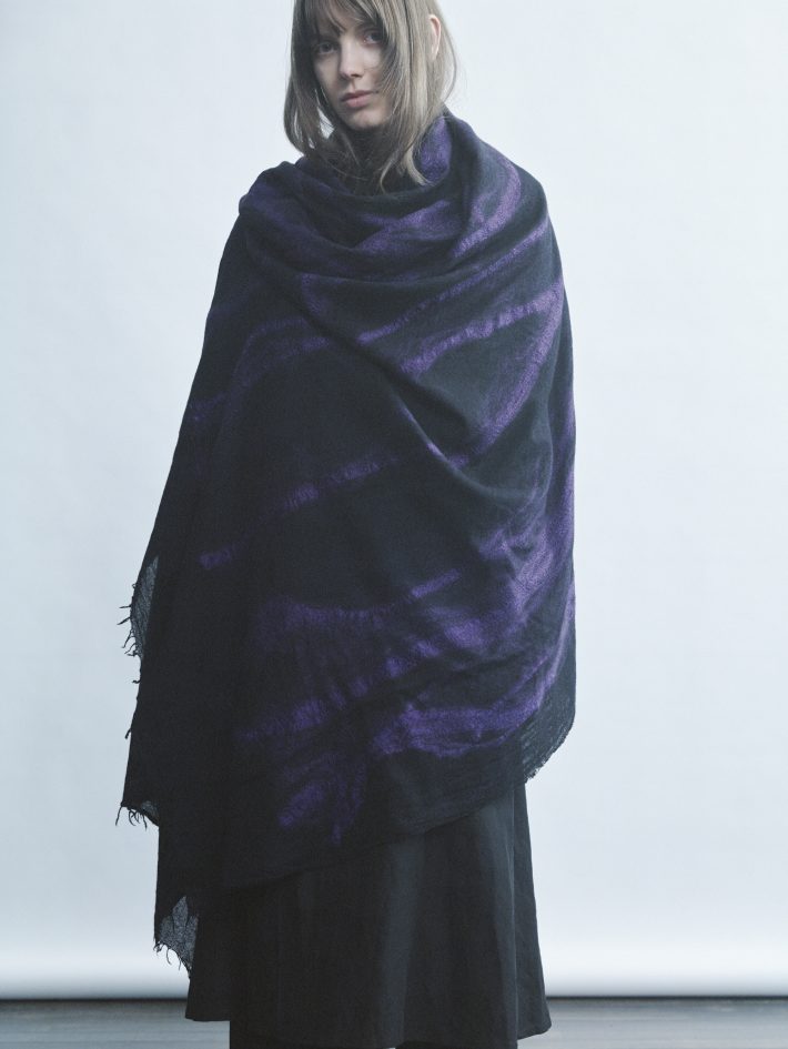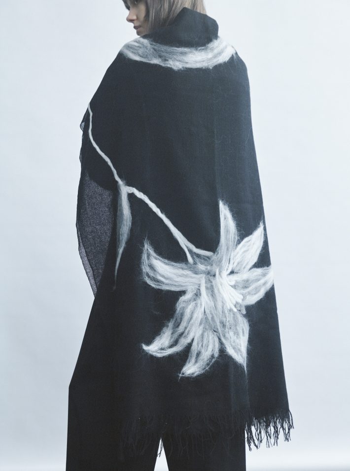 滑らかな肌触りのシルクウール素材に、シルクのスライバーをランダムに配置し、職人の手でニードルパンチ加工を施しています。重なり合う繊維が生み出す、奥行きのある表情としなやかな立体感が魅力です。