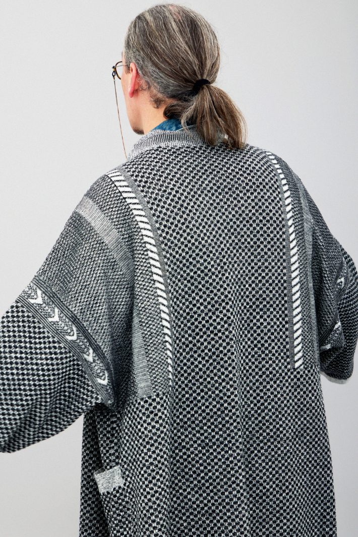 ニュージーランド産のファインウールと豪州メリノをブレンドしたなめらかで光沢のある防縮糸を使用しています。着用時に肩が落ちて柔らかな印象になる様にYASHIKIでは定番となった着物のパターンをオマージュして仕上げています。袖の付け根にはブランドアイコンの【矢絣】柄が入ります。