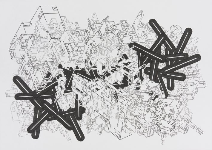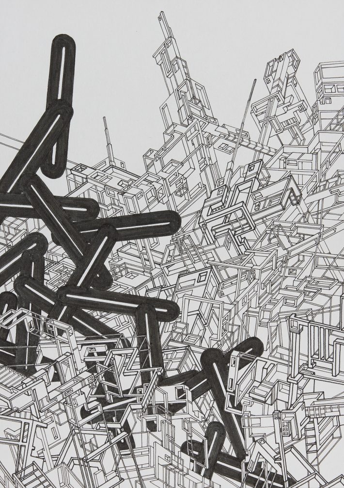 Tokyo is a city packed from one end to the other with buildings. People, cars, light and wind thread their way through the narrow cracks in between. It’s like navigating a labyrinth, at times triggering uncertainty at the possibility that no exit exists. This exhibition’s works utilize pole-like objects as organic symbols superimposed over the complex, inorganic, overlapping structures of the city, serving to express strength and endurance. While navigating the narrow streets and alleys between buildings, one might stop and look up, catching a neatly cropped view of the blue sky above and its clouds drifting past. I believe it is possible to free your mind from the oppression of time and space, even in the middle of such a built-up urban environment. My hope is that this exhibition will provide opportunities for you to experience the strength of each person as an individual.