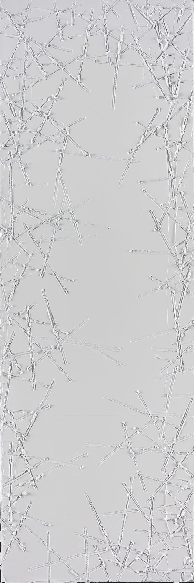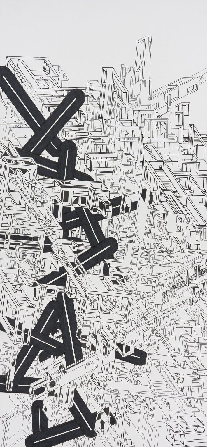 本展では、複雑に重なり合う無機質な街の構造の中に、「棒状の物体」を有機物の象徴として重ね合わせ、その強さと永続性を表現しました。ビルとビルとの細い路地を歩き、ふと上を見上げると、切り取られた青い空を白い雲が左右に流れていきます。時間と空間の圧迫から自分自身を解放することは、大きな街の真ん中でもできると私は信じています。本展が、人としての個の逞しさを感じる機会となれば幸いです。