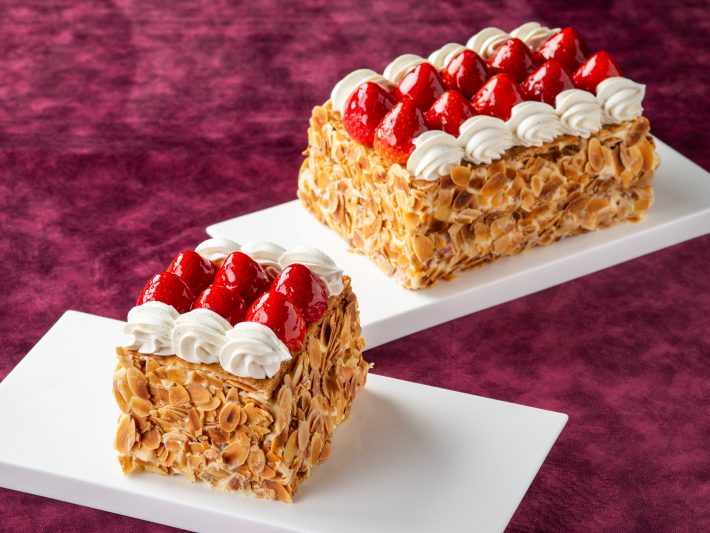 また、通常の苺のミルフィーユはテイクアウト商品としても販売しております。ご家族へのプレゼント、成人やご卒業、新社会人のお祝いにもぜひご利用ください。