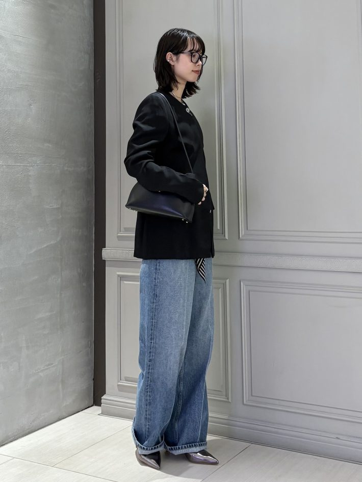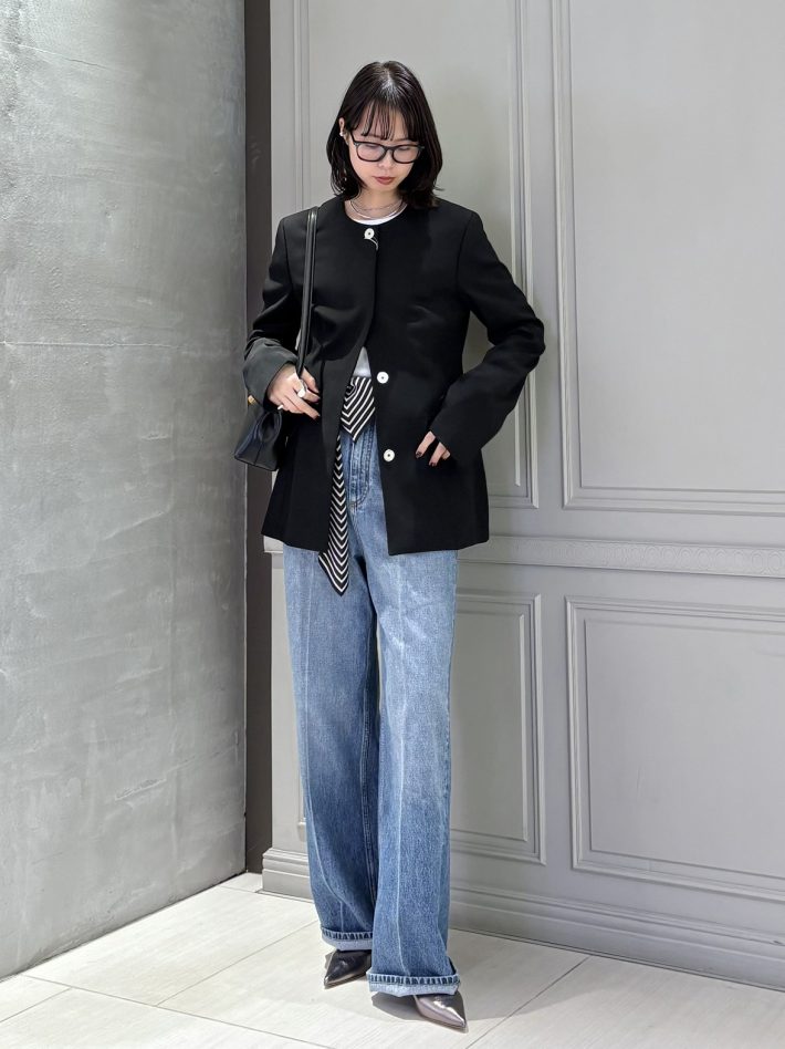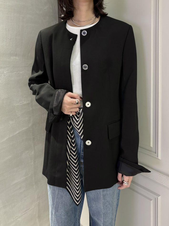 定番の黒ジャケットですが、今回の新作はボタンディテールと程よくウェストが絞られたシルエットで、新鮮さを感じられる一着です。コンパクトな身幅と長めの袖丈で、女性のボディラインを美しく見せてくれます。一番上のボタン以外は隠ボタンになっており、ボタンを開け閉めすることで雰囲気を変えて着用いただけます。