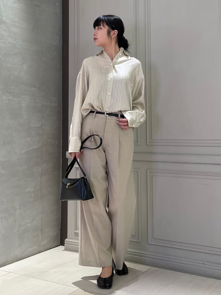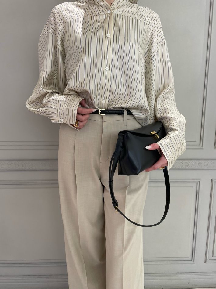 TOTEME定番のシルク100%のシャツを使った、リラックス感と上品さを兼ね備えたコーディネート。しなやかな光沢のあるシャツとハリのあるレザー小物を合わせることで、バランスの良いお仕事スタイルが実現します。