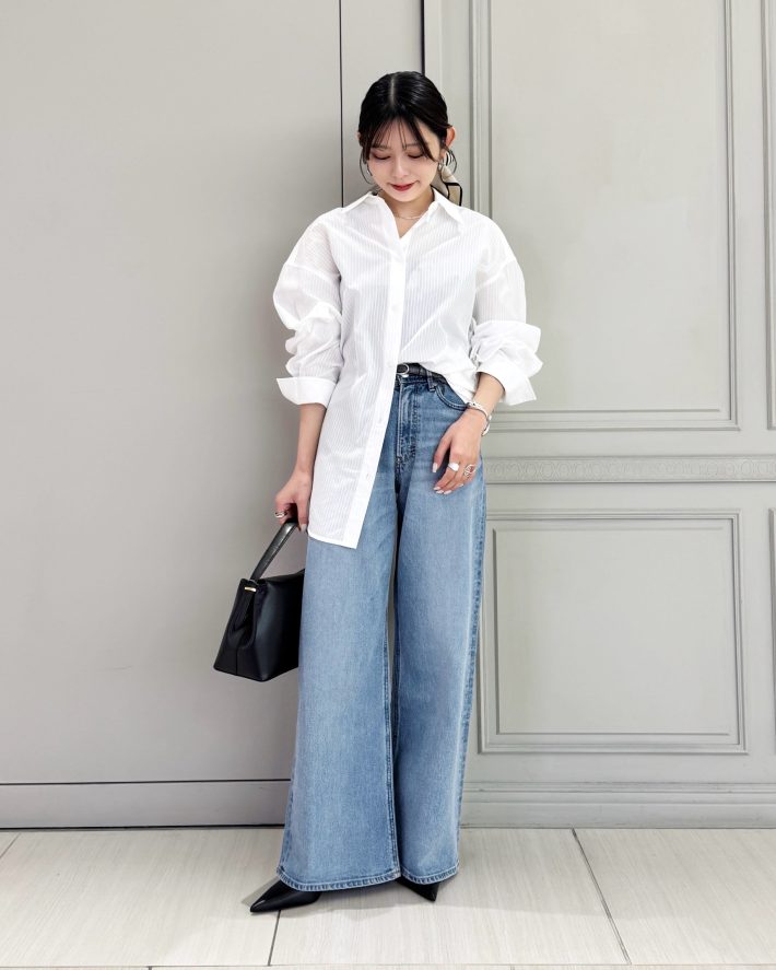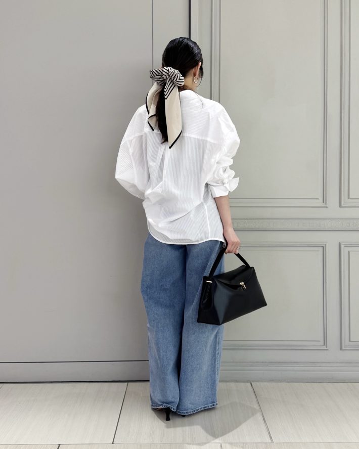 最後はベーシックな白シャツ×デニムの合わせに、大判のスカーフでアレンジを効かせたコーディネート。ヘアアレンジにスカーフを加えることで、アウターが必須な今の時期から、春の雰囲気を先取りすることができます。