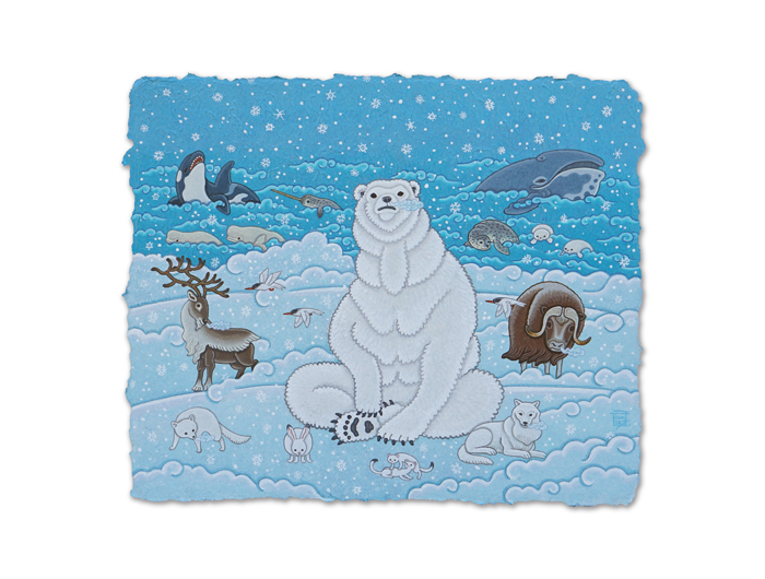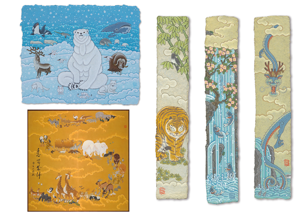 絶滅危惧種の動物たち、動物にまつわる吉祥や縁起物を手漉きの竹紙に独自の世界観で描く。