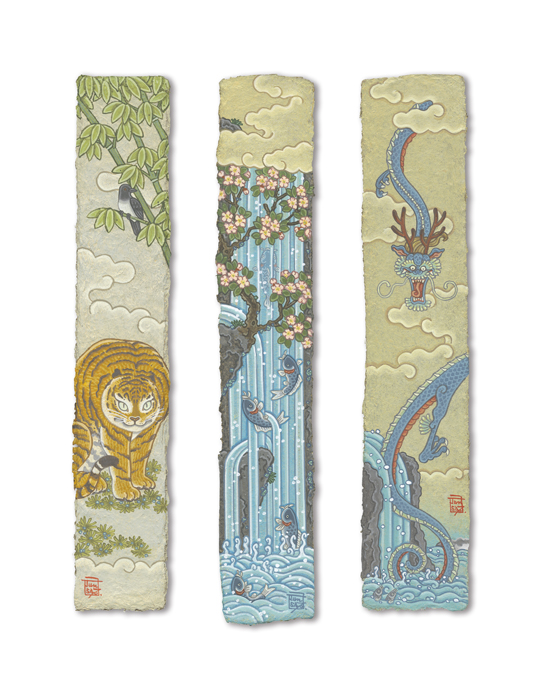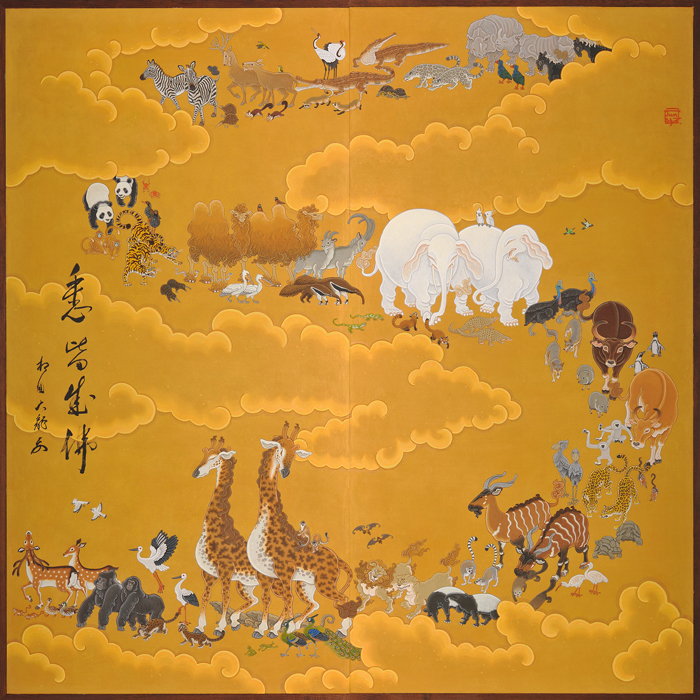 He depicts endangered animals, as well as auspicious symbols and lucky charms associated with animals, on handmade bamboo paper through his unique artistic vision.