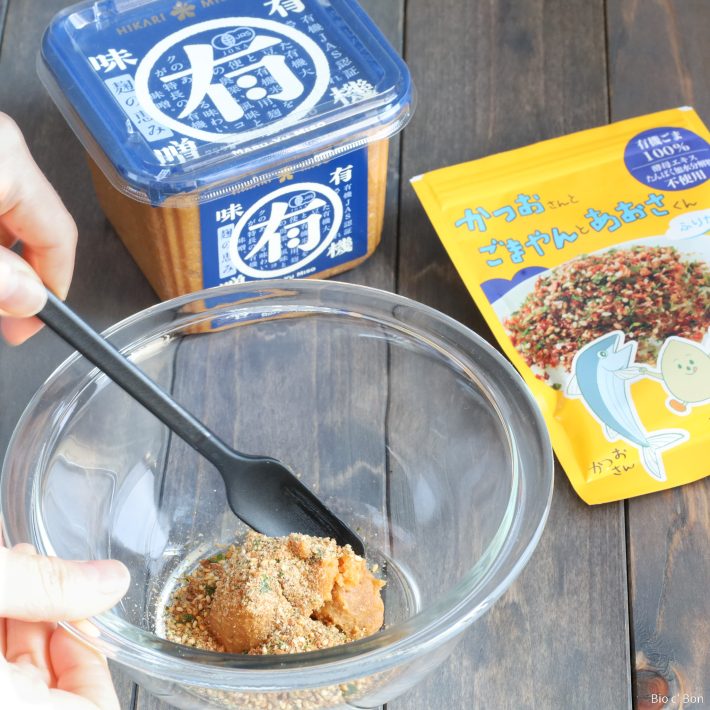 ②ボウルに味噌とふりかけを入れ、混ぜ合わせる。