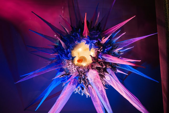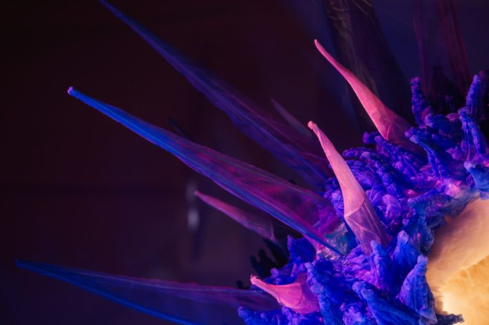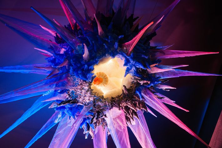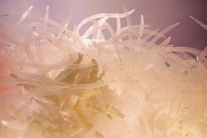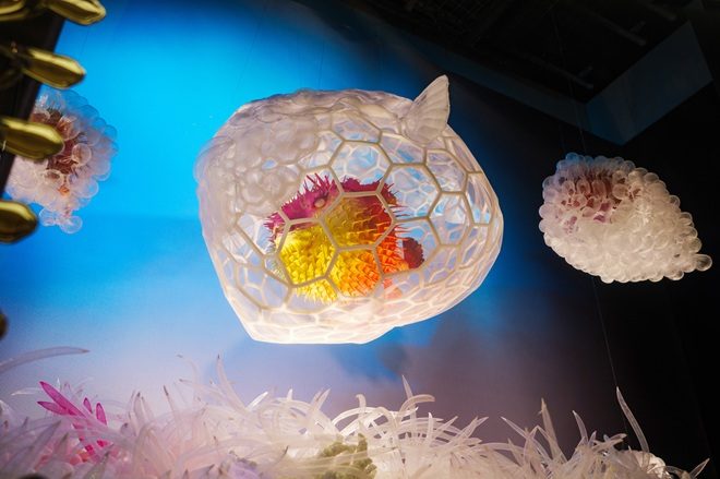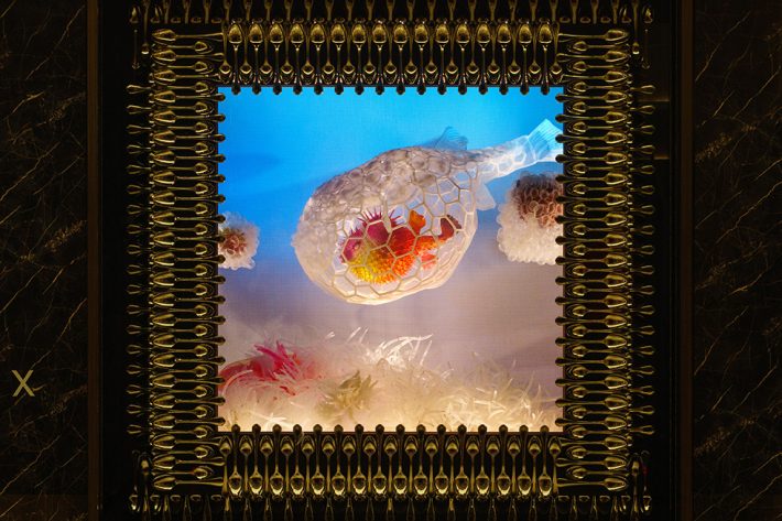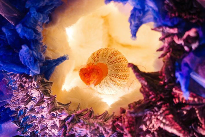 強さと繊細さ。攻撃と防衛。そのあわいにある人間らしい感情のあり方を、食の生き物の生存戦略から着想した想像上の生命体を描いた空間です。媚びずに可愛く尖る。拒絶ではなく、境界を示す。愛嬌の奥に思いやりを忍ばせながら、自分らしさを失わずに生きる。自分らしく生きるための知恵とエネルギーを感じ取っていただけたらと思います。