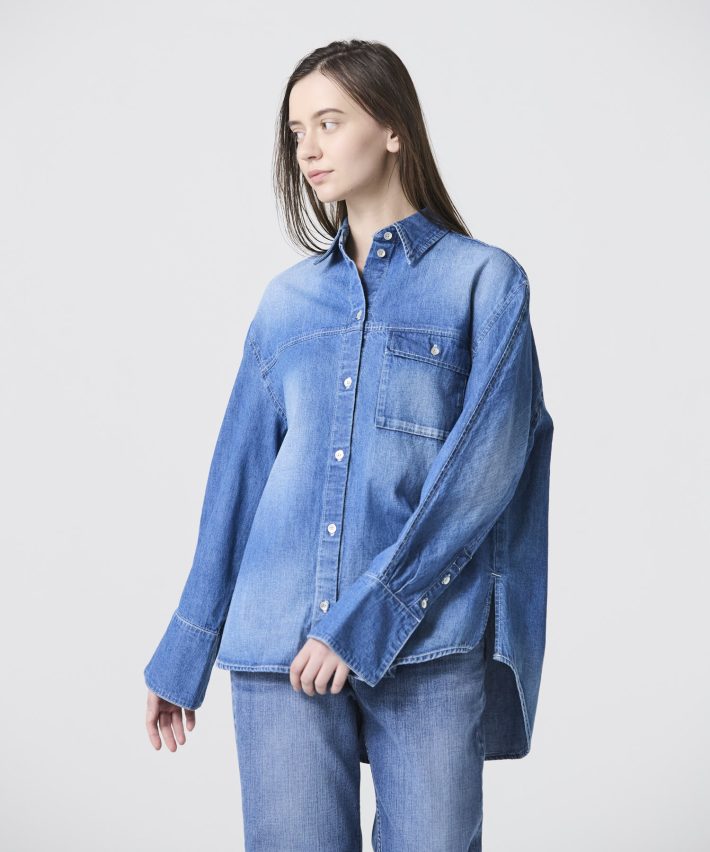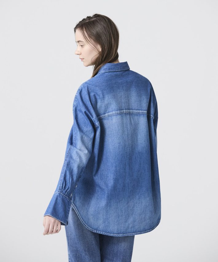 生地はカイハラ染めの7.25オンスデニムを使用。肩回りや胸元、袖に手擦り加工を施し、ヴィンテージ感のある仕上がりに。Tシャツやノースリーブの上に羽織ったり、ニットやジャケットとレイヤードにして、袖口からカフスを覗かせるニュアンスも楽しめます。