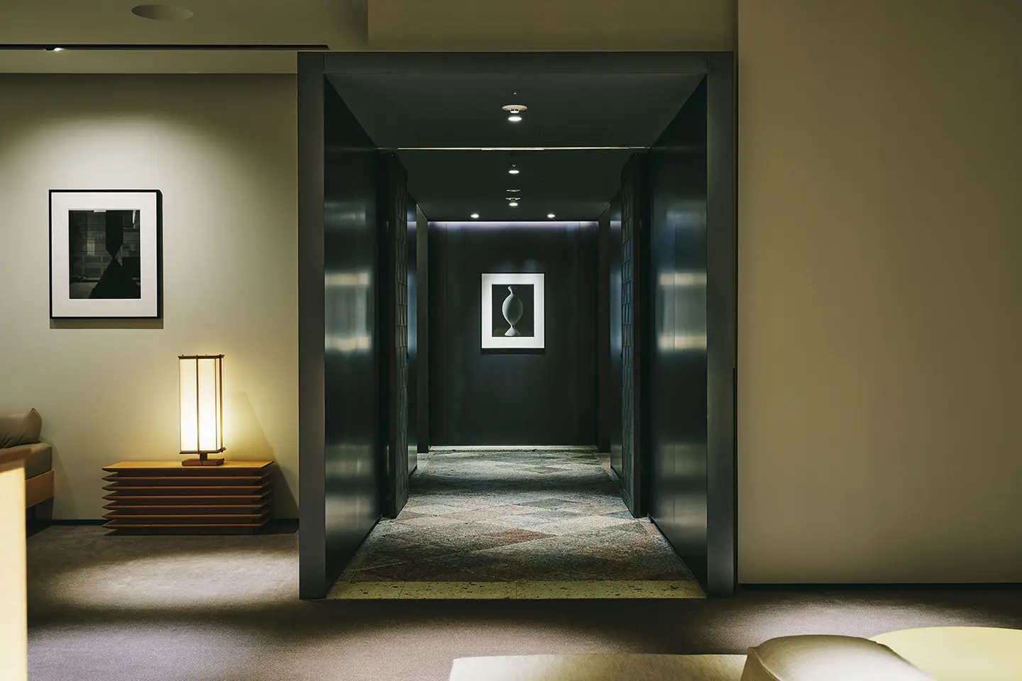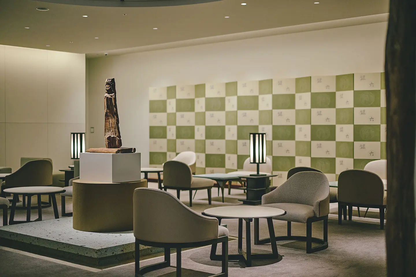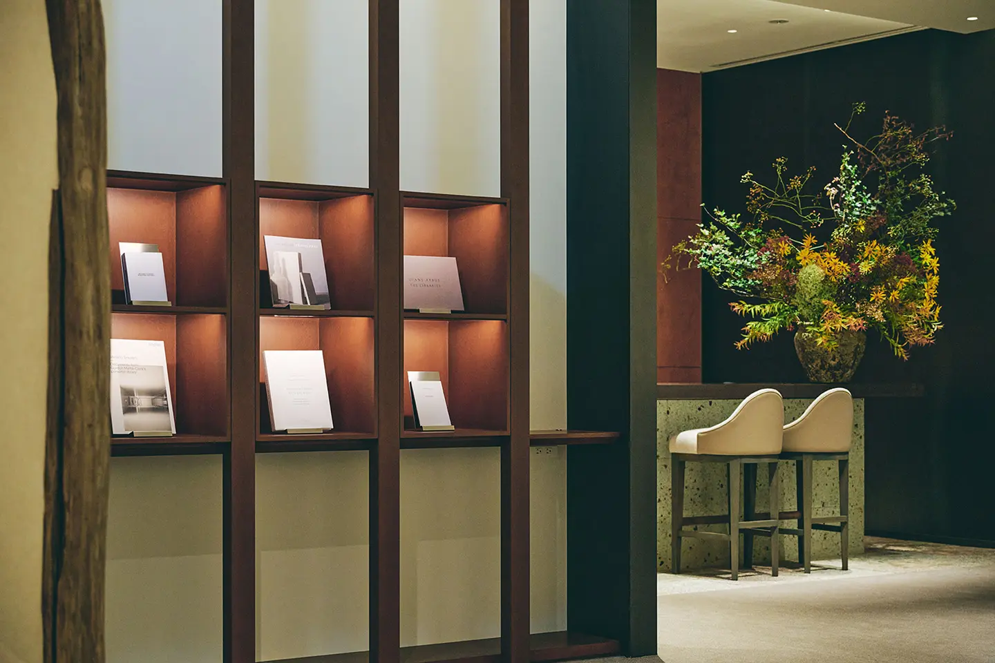 そして、メインルーム右奥にある“路地”。奥深い表情の黒皮仕上げの鉄板で覆われ、趣のある町家石を通り抜けると、もうひとつの世界へ。その先に広がるのは、寺社仏閣の秘仏などを設置する場「奥の院」のような空間です。粋が感じられる、素材の組み合わせの妙。モダンに潜む、日本の伝統的な技。空間の中央には、時代や国籍を問わずに美術品や作品を展示する「Spotlight Showcase」、そのそばには、テーマとともに一定期間ごとに選書が変わり、知的好奇心をくすぐる「Curiosity Shelf」。さらに、重厚な表情の大谷石がぐるりと取り囲む「Communal Table」は、新たな交流を育む起点へ。静と動が宿る、それぞれの空間。五感が研ぎ澄まされ、心安らぐも、心地よい緊張感も漂う現代の社交場をぜひ。