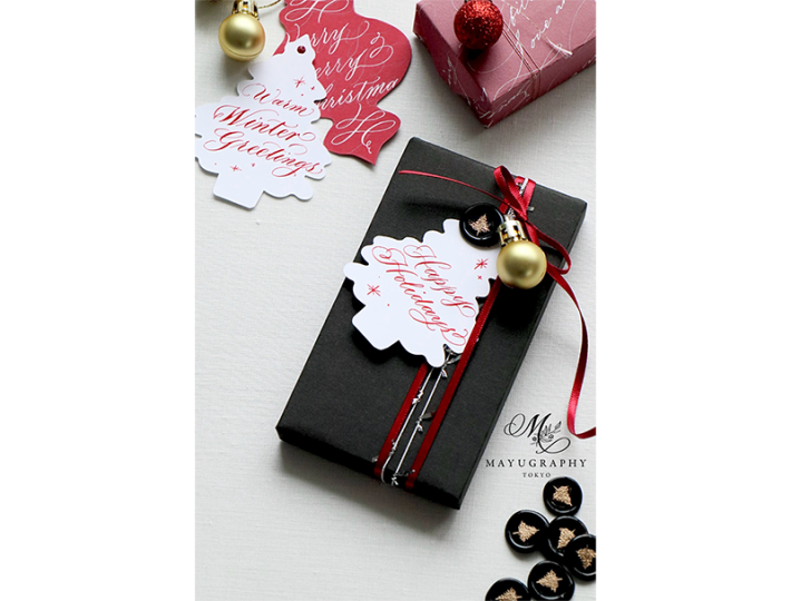 栞やオーナメントモチーフのカードからお好きなデザインをお選びいただき、カリグラファー・万遊さんが、お名前やメッセージをその場で書き入れます。あなただけのオリジナルアイテムが完成。