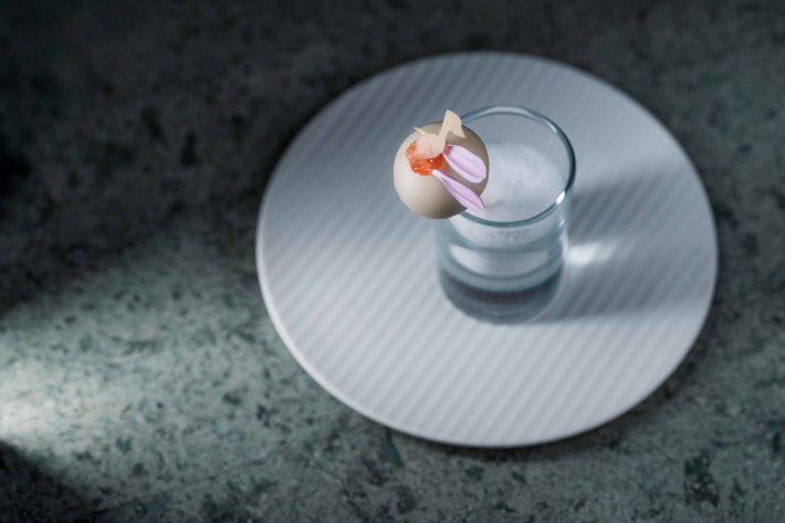 レストランでアミューズとして提供している一品がラウンジに登場。カカオバターでコーティングしたフォアグラを紅玉のマルムラードと共にお楽しみください。
