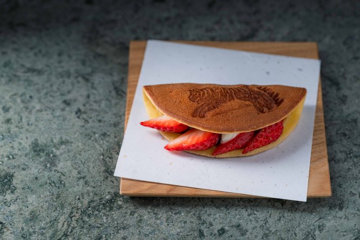 餅粉を配合して焼き上げたもちもちのどら焼き生地で、農家直送のいちご、チーズクリーム、バター、甘さ控えめなつぶし餡をサンドした生どら焼き。フレッシュないちごの酸味とつぶし餡の優しい甘さをお楽しみください。