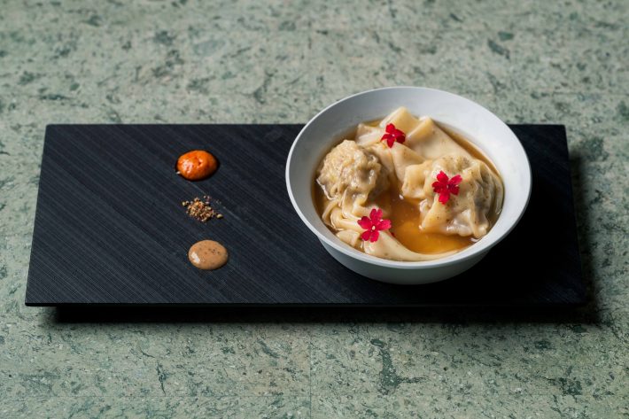 フォアグラの甘やかで濃密なコクと、トリュフの鋭さを含んだ芳香。それぞれの旨味が互いを押し上げ合い、味わいを立体的に昇華させます。餡には地鶏のミンチを主軸に、香味野菜やスパイス、さらにスープと鶏油を練り込み、幾重にも旨みの層を構築しました。