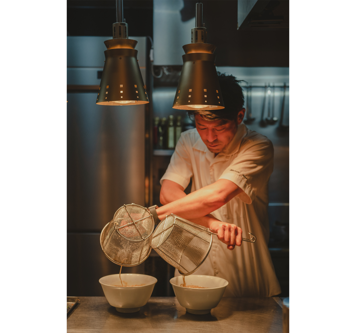 創業以来、「ラーメンの無限の創造性と可能性」をテーマに、日本のUMAMI文化と世界中の様々な食材を融合させた一杯をお届けしています。無化学調味料にこだわり、厳選した安心・安全な国内外の食材を用い、豊富な知識と的確な技術から生まれる和洋中が融合した一杯は当店の特徴であり、代名詞です。